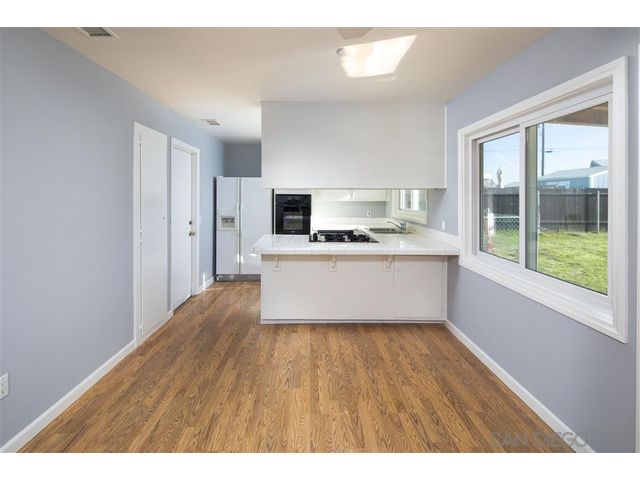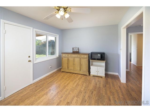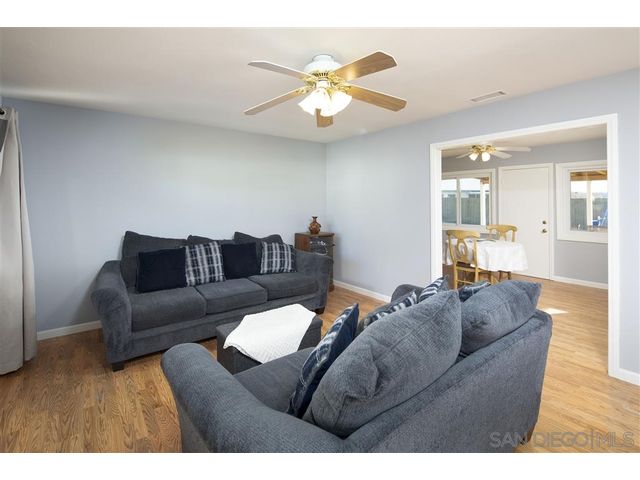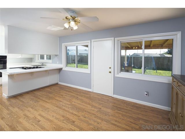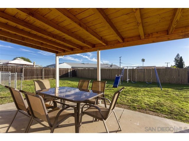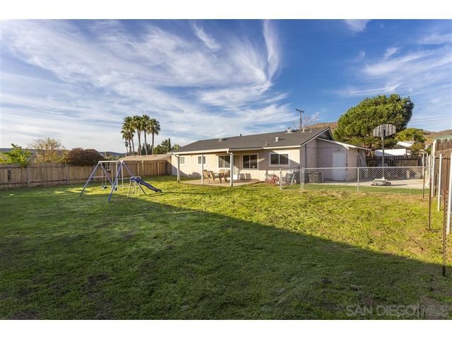 Charming single story home in a quiet neighborhood with freshly painted interior, AC, dual pane windows & RV parking with hookups on left side of house. Large fenced backyard with a covered, lit patio area. One side of the backyard also boasts a separate fenced-in cement area with small section of turf & pedestrian door to the garage - perfect for a dog run. Kitchen has counter tops that can fit bar stool seating, garage access, freshly painted cabinetry & dining area that leads out to the backyard patio.