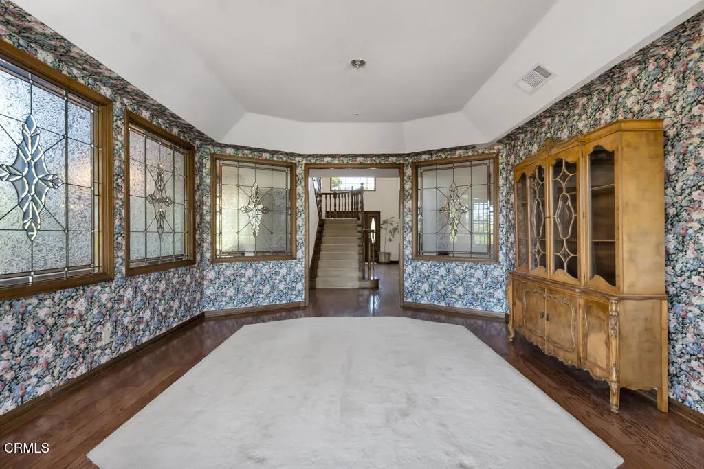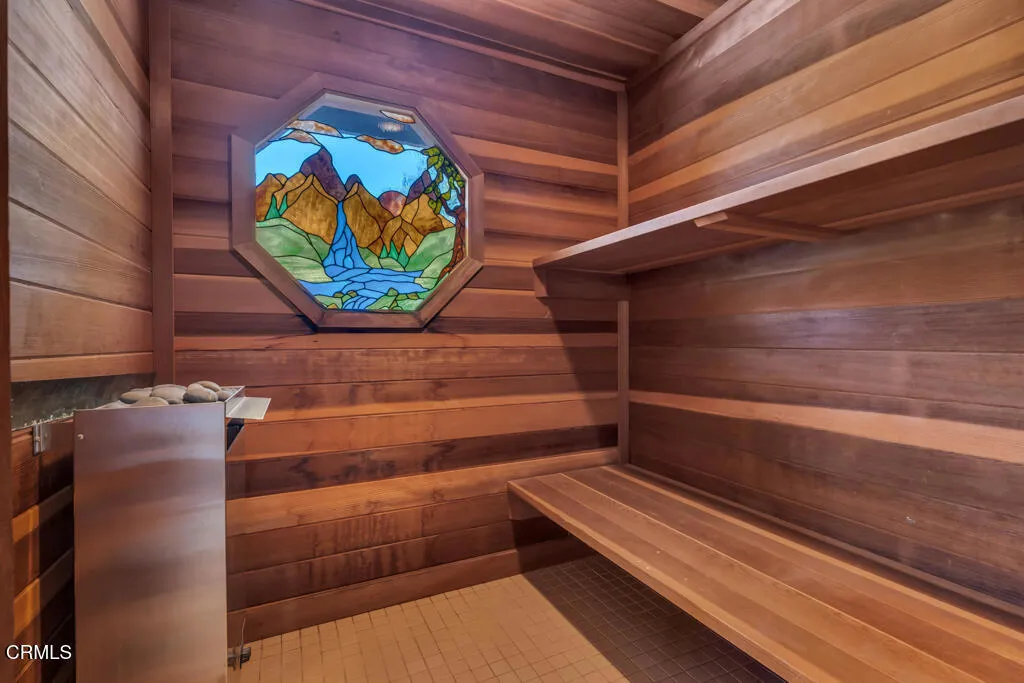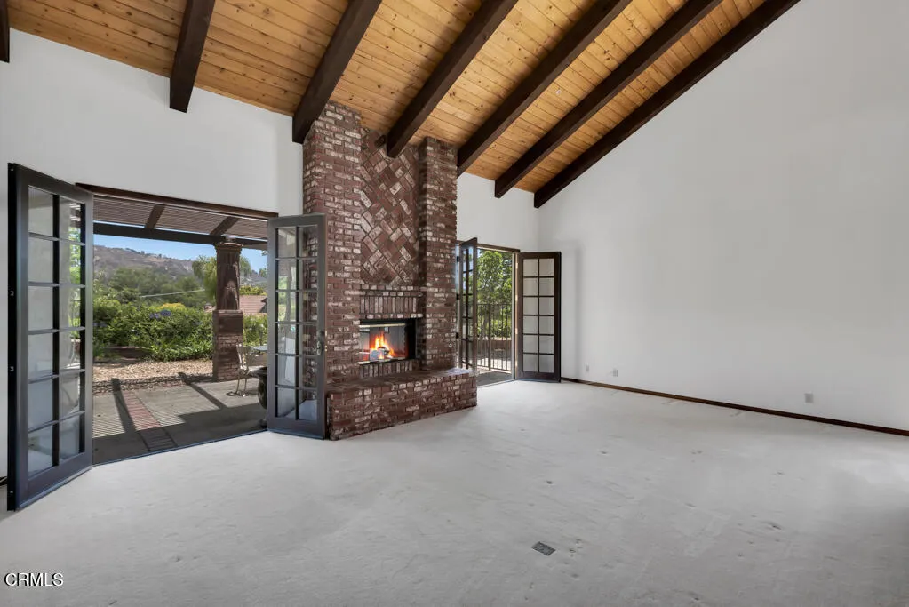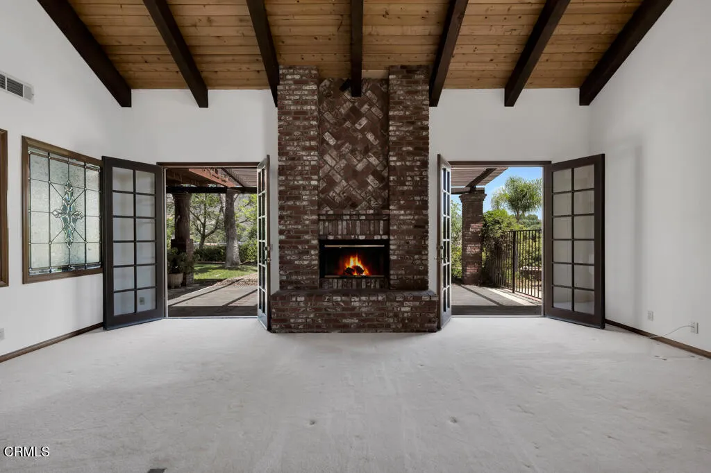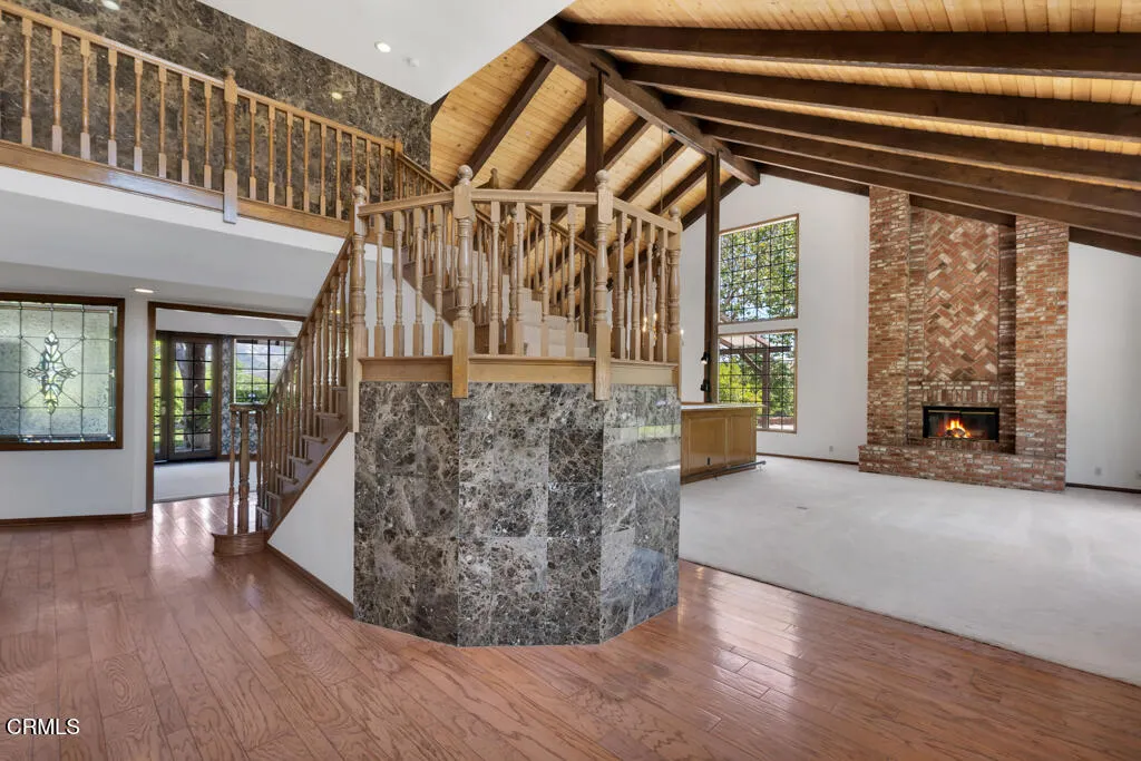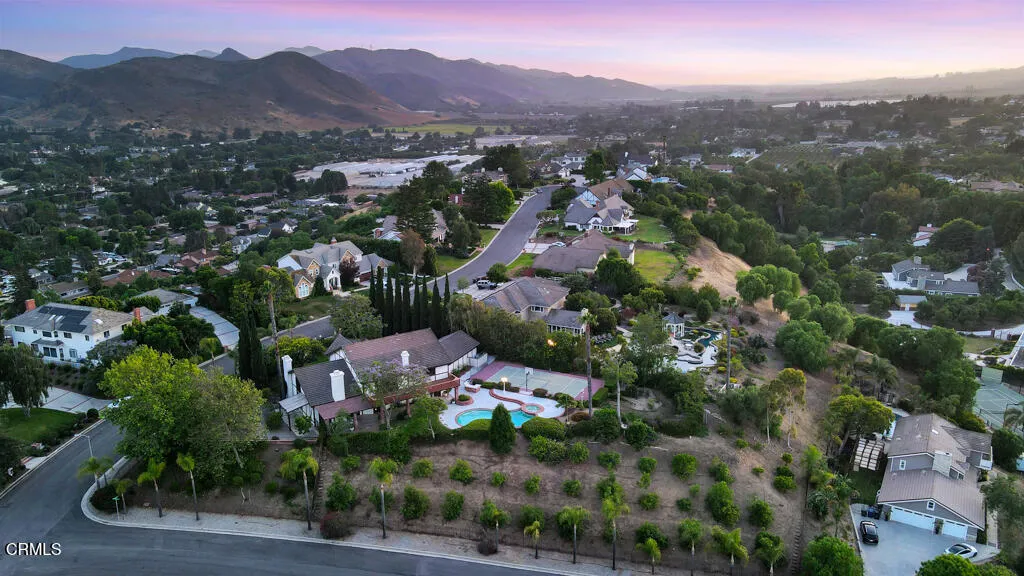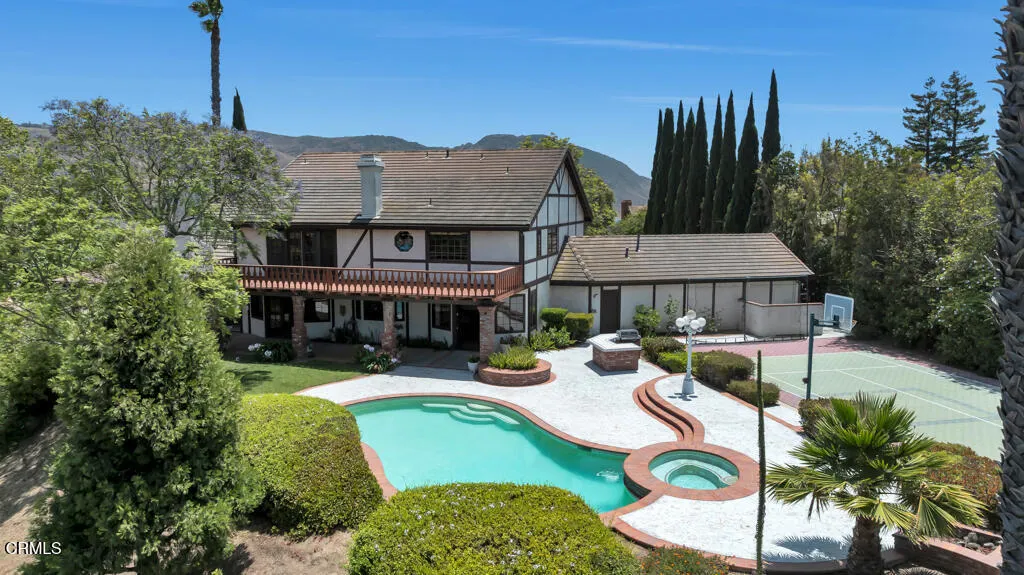 Perched above the valley behind private gates on over an acre, this custom Tudor-inspired estate blends timeless architecture, storybook charm, and old-world craftsmanship--offering panoramic views of the surrounding mountains. The brick and wood facade sets the tone for a property rich in character, with a resort-like backyard featuring a sparkling pool and spa, full sport court, covered patio, and dozens of mature fruit trees--all framed by lush gardens and a peaceful hillside backdrop.Inside, dramatic volume and warmth welcome you. The grand formal living and family room share one expansive space with soaring beamed ceilings, dual brick fireplaces at each end, and a custom-built bar anchoring the center. Natural light pours in through oversized windows and multiple French doors, creating effortless indoor-outdoor flow from every entertaining space--including the kitchen, dining, living, and family rooms.The kitchen is centrally located and ideal for entertaining, with granite counters, rich wood cabinetry, central gathering island, and a sunlit breakfast nook that opens to the patio. A formal dining room with French doors adds elegance and versatility. A downstairs en-suite bedroom with full bath provides a private space for guests or multi-generational living.Upstairs, the primary suite feels like a retreat, with vaulted tongue-and-groove ceilings, a cozy stone fireplace, and French doors opening to a large private deck with sweeping views. The spa-style bath features dual vanities, a large soaking tub beneath a picture window, expansive walk-in closet, walk-in shower,