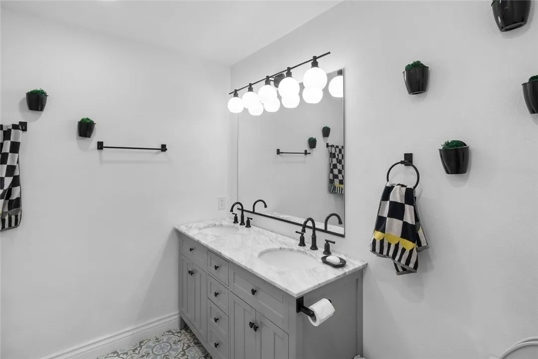 Discover refined living in this stunning single-story residence, nestled in the coveted Rancho Cascades neighborhood. Boasting an expansive 2,220 square feet of beautifully remodeled space, this turnkey home sits on a generous 12,800 square foot lot, offering both privacy and room to breathe. As you enter through the custom wrought iron double doors, you are greeted by an inviting foyer that leads to an open-concept layout accentuated by vaulted ceilings and recessed lighting throughout. The heart of the home is the fully renovated kitchen, featuring an expansive island, upgraded cabinets, sleek countertops, and a farmhouse sink. Custom under-cabinet lighting enhances the modern aesthetic, making this space perfect for both cooking and entertaining. With 4 spacious bedrooms and two elegantly remodeled bathrooms, including a luxurious primary suite with a glass shower and a clawfoot tub, comfort and style are paramount. Each bathroom features upgraded fixtures and finishes, ensuring a spa-like experience. The property is enhanced by an automated steel driveway gate for added security and a beautifully landscaped front lawn adorned with palm trees and custom concrete slabs, complemented by synthetic grass for low maintenance. The upgraded side entry features a stylish metal fence, adding to the homes modern appeal. Additionally, the two-car garage has been thoughtfully converted into a versatile bonus room, complete with upscale finishes and a restroom, ideal for an office, gym, or game room. It also includes a private soundproof podcast booth, perfect for content creators. C