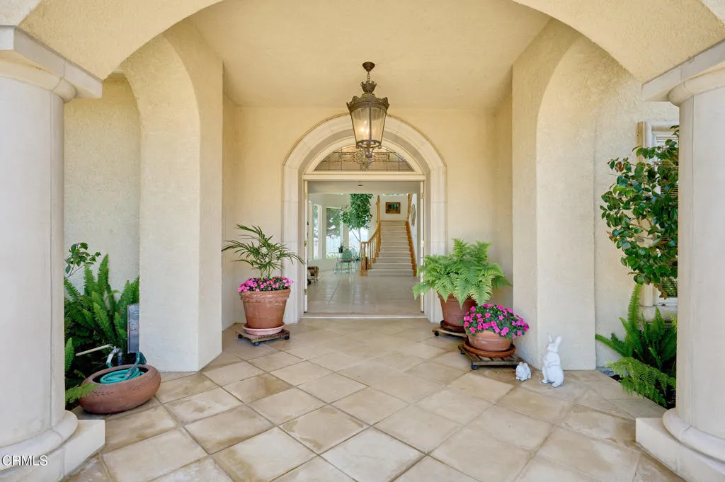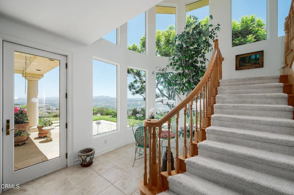 With jaw dropping panoramic views of the picturesque Santa Rosa Valley clear to the Channel Islands, this 5 Bd 5 Ba, 5288 sq ft gated custom estate sits high above the rest offering a truly elevated lifestyle. The home has incredible curb appeal. The moment you arrive, the home radiates sophistication, emotion, and timeless beauty. Enter through grand stone arches to doors adorned with leaded glass, and step into a world of soaring ceilings, rich textures, and natural light streaming through towering windows. The entry hall stuns with hand-laid beveled limestone floors and dazzling crystal chandeliers, setting the tone for what lies beyond. A classic center-hall floorplan guides you toward the living room with fireplace to the left, and a refined dining room with adjoining butler's pantry to the right. At the heart of the home, the gourmet island kitchen is well appointed, with built-in refrigerator, breakfast nook, abundant storage. Open to the kitchen, the family room focus is the beautiful views out windows on either side of a hand-carved stone fireplace mantle. This home incorporates thoughtful craftsmanship, from intricate moldings to oversized picture windows designed to capture the stunning views. A bedroom and full bath ensuite is also located downstairs as well as a well-appointed powder room.Upstairs, there are three secondary bedrooms. The primary bedroom is a grand suite with sitting area, and an enormous private deck with dramatic precast balustrades with direct access to the pool below. The primary bath has large dual closets, spacious shower, closed commode w