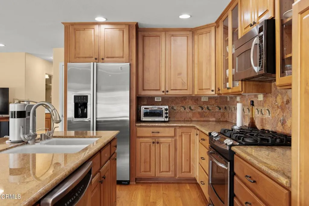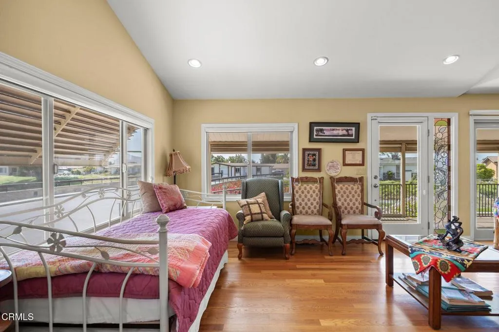 PRICE IMPROVEMENT - Welcome to Poinsettia Gardens, Ventura's premiere, over 55 community where you own the land and pay low monthly HOA dues of $357. One of the best locations within the community as the Clubhouse, pool, spa is directly across the street and views of the pond from the front patio- yes, it's a waterfront home. This updated home includes an open floorplan with kitchen offering warm honey oak cabinets, granite countertops, island with sink, stainless appliances included with ascents of glass cabinet faces. The kitchen opens to the southern exposure / light and bright living room with vaulted ceilings, neutral tones, hardwood flooring throughout, slider to front porch, and more. The primary suite offers an additional bonus room perfect for home office, crafts, or workout room, walk-in closet, and in-suite bathroom. The secondary bedroom is ample in size. Carport with built-in storage room that offers additional storage space, washer and dryer included, ceiling fan, central A/C, dual pane windows, and a lot more to offer.