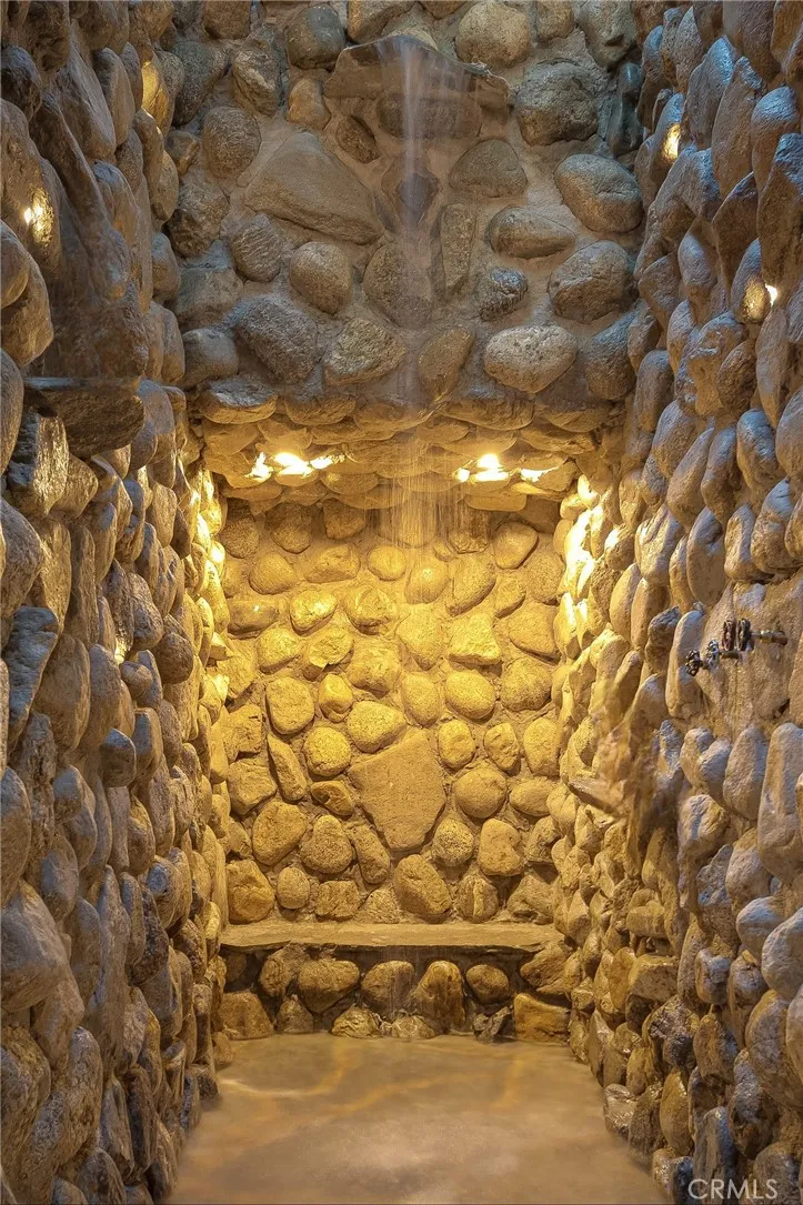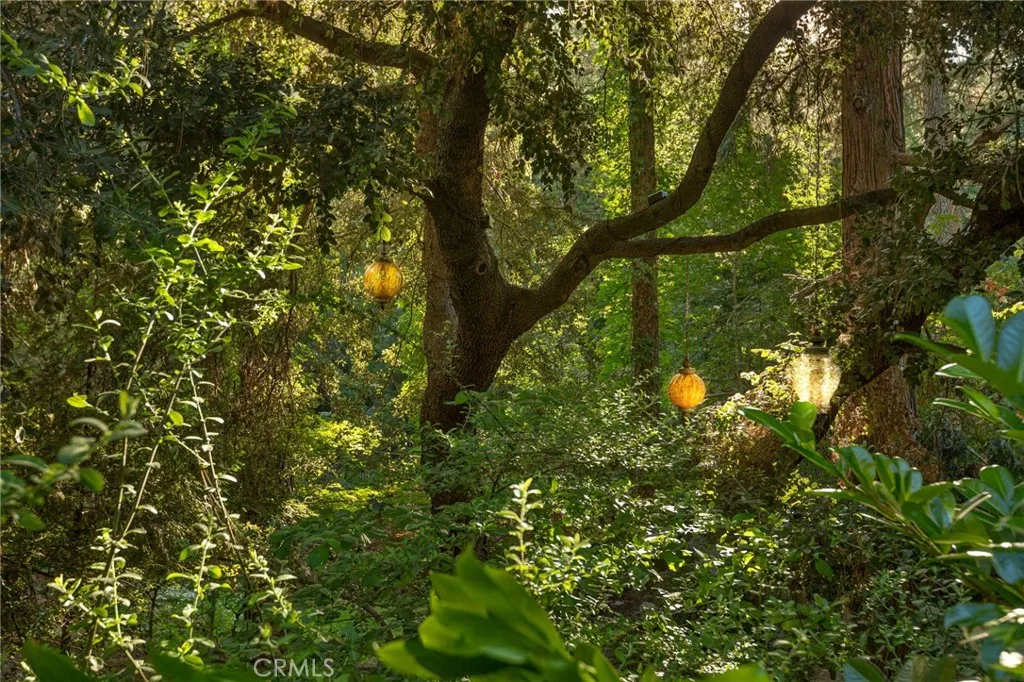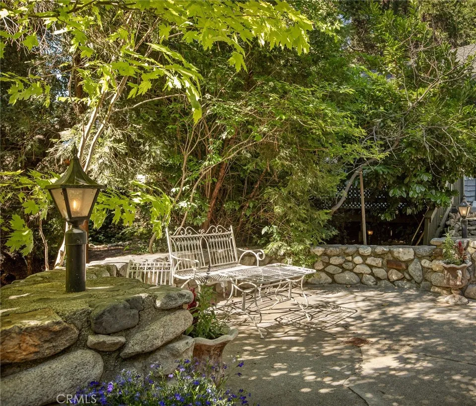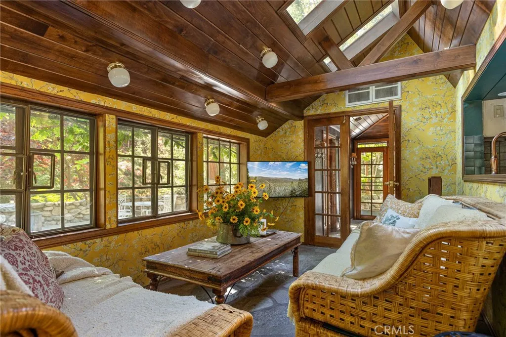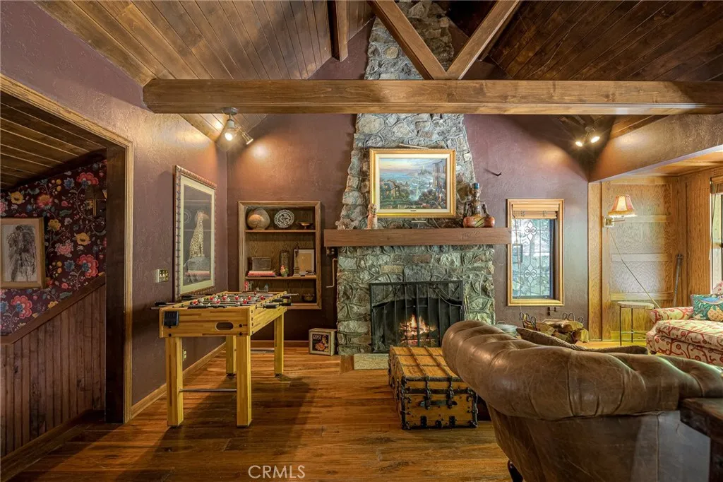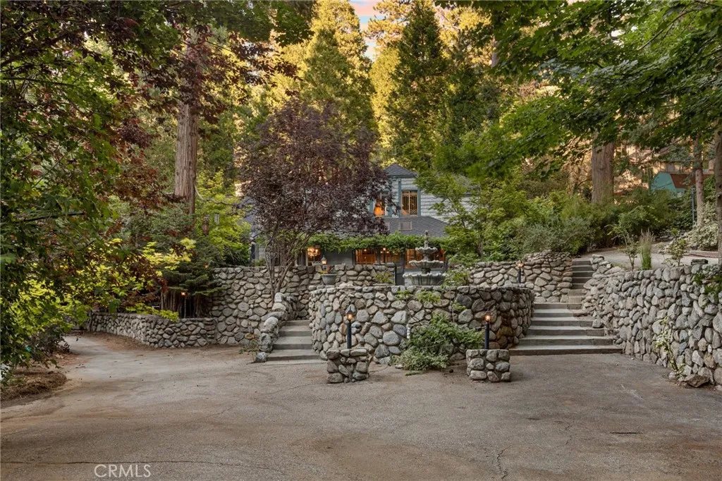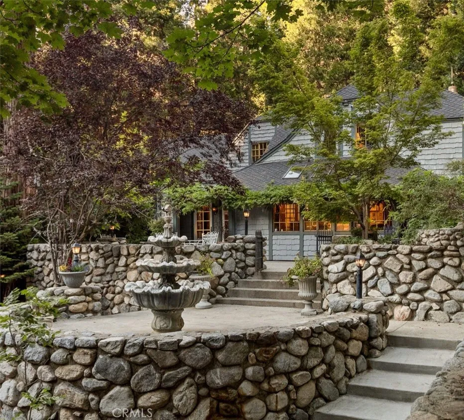 Featured on Zillow Gone Wild, this legendary cabin whispers stories of old Hollywood charm and elite escape. Long rumored to be the secret hideout of the Queen of Hollywood, Myrna Loy, The Greystone Manor continues to attract discerning travelers, artists, and tastemakers from around the world. Behind the gates, a winding drive leads to this rare gem, privately situated on an acre. The atmosphere is cinematic: dappled sunlight through towering pines, a stone fireplace flickering in the great room, and expansive windows framing views that shift with the seasons. Surrounded by vibrant oaks, whispering pines, mature bamboo, and bursts of seasonal color from Japanese maples, the setting is enchanting. With parking for over 10 vehicles and a 2-car garage, the manor welcomes guests with a sense of grandeur. Once inside, the main living room features a classic stone fireplace and vaulted open-beam ceiling, paired with rich hardwood floors. The country-style galley kitchen features imported slate flooring that flows seamlessly into the formal dining room, breakfast nook, and sunroom, creating a cohesive old-world warmth. Stained glass windows and French doors enhance the ambiance, while the chandelier-lit dining room opens directly to stone patios, perfect for al fresco meals beneath the stars. The primary suite is nothing short of magicalcomplete with a custom stone grotto waterfall shower. Just beyond, a whimsical through the looking glass hallway leads to an intimate theater roomideal for screening vintage classics with friends and family. Upstairs, youll find four more guest be