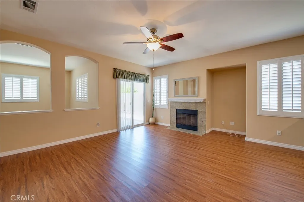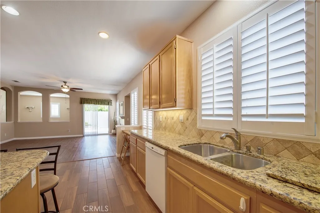 Highly upgraded and customized home with OWNED SOLAR at a premier "Over 55" gate guarded golf resort. Wood type tile and vinyl floors, plantation shutters and custom paint throughout. Great curb appeal with flagstone type accents and covered front porch. Enter into a flex room with leaded glass windows usable as a parlor, formal dining room, music room or office. Big kitchen featuring granite counters, gorgeous tile backsplashes, expanded island with breakfast bar, cabinets galore, large pantry, desk and dining area. The living/great room has a beautiful tile fireplace, ceiling fan, slider to the covered patio and entertainment niche. Big office/den convertible to a 3rd bedroom. Grand master suite bedroom with leaded glass window and ceiling fan. The master bath has a dual sink vanity, separate tub and shower, walk-in closet with mirrored doors, linen cabinet and a private commode. Generous sized guest bedroom with ceiling fan, mirrored closet doors and adjacent full bath. Laundry room washer and dryer are included. Covered patio, low maintenance gardens, wide side yard and vinyl fencing all around. 2-car finished garage with lots of overhead storage racks. HOA dues include front yard maintenance and trash pick-up. No Mello-Roos. Extraordinary community amenities include a 22,000 sq. ft. clubhouse with immense auditorium with indoor and outdoor stages, dance floors and commercial kitchen. Media/card room, multi-purpose rooms, state-of-the art fitness center, library, computer center and billiard parlor. Tropical pool and spa. BBQ area set against a lovely mountain backdrop.