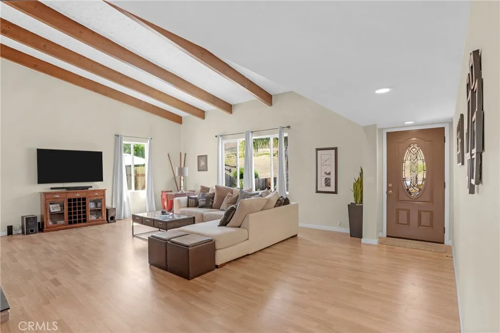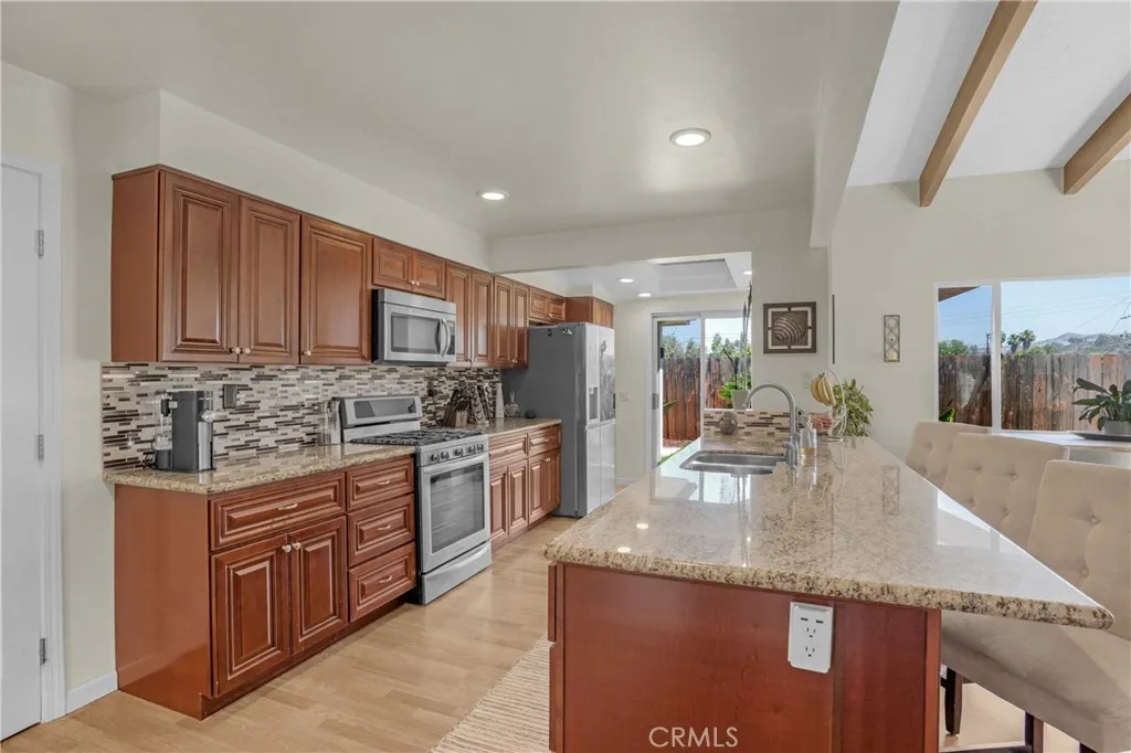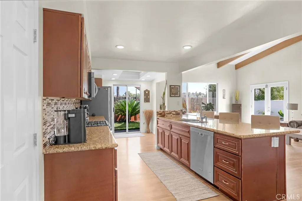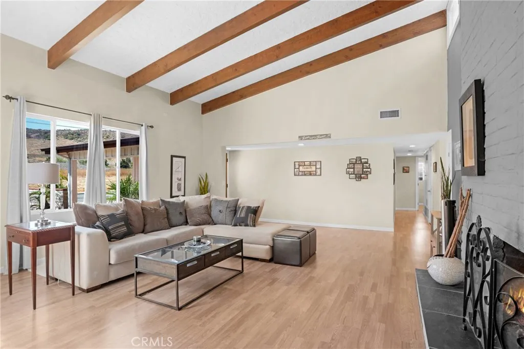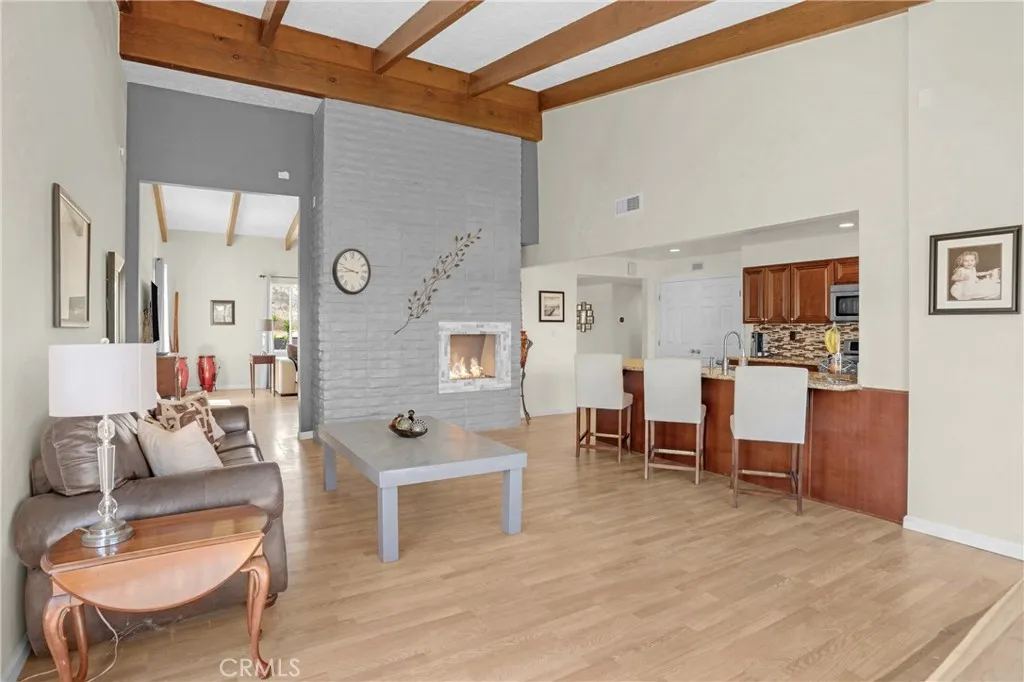 Come view this beautifully updated home that combines timeless character with thoughtful modern touches. The home is much larger inside then you think. 2271 Sq Ft. Gather around one of three inviting fireplaces , or host with ease in the open floor layout featuring dramatic vaulted wood-beam ceilings. Most recently remodeled in 2025, includes a new modern gas fireplace between the family room and kitchen, and a new backyard retaining wall just to name a few. This home offers both comfort and style throughout. The light-filled interior includes a spacious formal living room, dining area, and an open kitchen that flows seamlessly into the family room perfect for casual gatherings. The kitchen is a chefs delight with granite countertops, custom cabinetry, a large island with bar seating, newer stainless steel appliances, recessed lighting. Retreat to the generous primary suite, complete with two closets, also includes a recently renovated en-suite bathroom featuring a tiled walk-in shower, double vanity and upscale finishes. Two additional large bedrooms offer ample space and share a beautifully designed second full bath. Other highlights include dual-pane windows, central heating and air, ceiling fans, beautiful wood vinyl flooring, and abundant storage. The private backyard provides a peaceful outdoor setting with room for entertaining, gardening, or play. The detached two-car garage and newer bricked wide driveway ensures plenty of parking. Enjoy low-maintenance landscaping in both front and back yards, complete with automated sprinklersideal for outdoor enjoyment without t