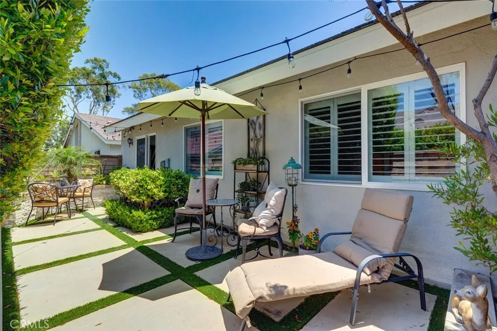 Welcome to 10 Glenhurst! This beautifully updated single-story end-unit is located in the highly desirable Woodbridge community. With an open floor plan, this home features 2 spacious bedrooms, 2 full bathrooms, and a convenient 2-car direct-access garage. A charming double door entry opens to a welcoming foyer featuring porcelain matte wood-look flooring laid in an elegant herringbone design, setting the tone for the stylish updates found throughout the home. The flooring continues through the main living areas, offering durability and modern appeal, while the bedrooms are finished with new plush carpet for added comfort. The living room is bright and airy, enhanced by vaulted ceilings and a tile-accented fireplace that adds warmth and charm. The separate dining area flows seamlessly into the kitchen, which includes updated stainless steel appliances, beautiful new countertops, and recessed lighting. A sliding glass door leads to the spacious patio with newly redesigned combination of concrete hardscape and softscape featuring artificial turf and natural stone wrapped planters filled with trees and shrubs to create an outdoor space that strikes as the perfect balance between greenery and function. Whether you're hosting friends, dining al fresco, or simply relaxing under the sun, this inviting and private patio offers an ideal setting for both entertaining and everyday enjoyment. The remodeled primary suite features a walk-in closet, dual quartz vanities, and a walk-in shower. The secondary bedroom includes mirrored closet doors. The remodeled hallway bathroom offers a soa