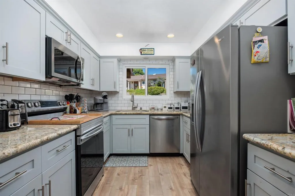 This beautifully REMODELED single-story home nestled in the 55+ community of Oceana III offers 2 spacious bedrooms and 2 bathrooms, all set against a backdrop of serene, open green space. Within proximity to the community pool and clubhouse, the location couldnt be better! Enjoy peace of mind with the following recent upgrades: modern stainless appliances, double pane windows, water heater, furnace, AIR CONDITIONING, Ceiling fans, beautiful rich wood laminate flooring. The kitchen has been completely remodeled with rich mocha cabinetry, sleek granite countertops, a contemporary subway backsplash, recessed lighting and stainless-steel appliances. The kitchen has a window that looks out to the open green space and brings in a lot of natural light. Both bathrooms have been completely remodeled with modern vanities, adding a crisp, clean aesthetic. The primary bedroom with its en-suite bathroom has mirrored closet doors, rich wood laminate floors and is nice in size. The additional bedroom also has mirrored closet doors and rich wood laminate floors. The main living area provides a comfortable and inviting space for relaxation or entertaining. Enjoy year-round outdoor living on the spacious covered patio which has an epoxy coating. The attached one car garage also includes epoxy flooring and laundry hookups. Residents enjoy access to a well-appointed clubhouse, fitness center, pool, spa, and beautifully maintained walking paths, along with shopping and dining less than a mile awayand Oceanside Harbor, local beaches, and the 5 freeway all within a 10-minute drivethis home offers