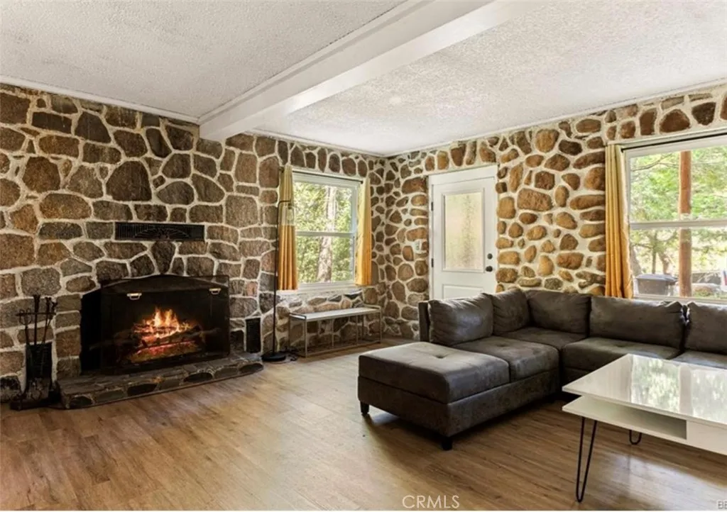 Located in the popular San Moritz neighborhood of Crestline and only minutes from Lake Gregory is this charming 2-bedroom, 1 bath home, with level entry and plenty of parking. The lower-level features stone walls and an open concept floor plan. The living room flows into the kitchen, and you will also find the bathroom on this level. The second level has two bedrooms and a large bonus room that would be a great office space or game room. All in all, this is a very comfortable and cozy home with pleasing curb appeal. The level backyard really stands out as a rare feature in the mountains. A privacy fence has been added, along with a chain-link fence with a gate, providing a secure area for kids or dogs to play. Crestline is a great place to live full time or part-time. You will love the local the trees and forest environment, the community events and also the quaint rural feeling that affords a break from the concrete jungle. Crestline is also within a reasonable commute time to San Bernardino, Redlands, Rancho Cucamonga and Riverside. *Current 1/4 bathroom is a sink only. There is a place noted by the current owner's plumber to add a 1/2 bathroom and laundry hookups.