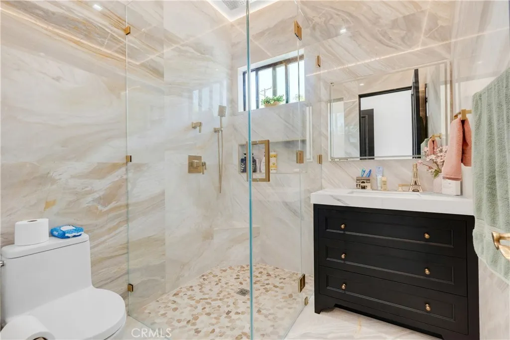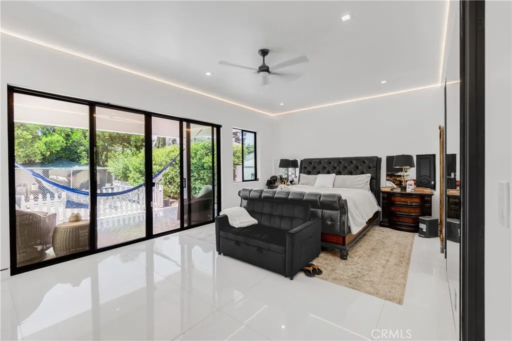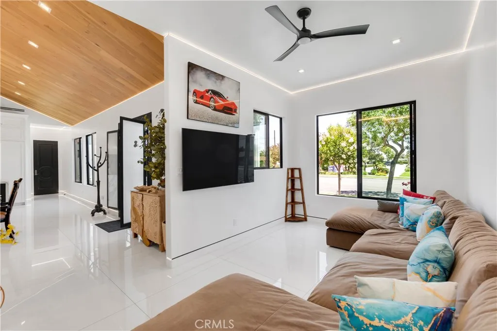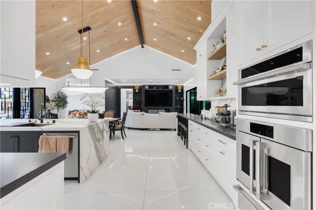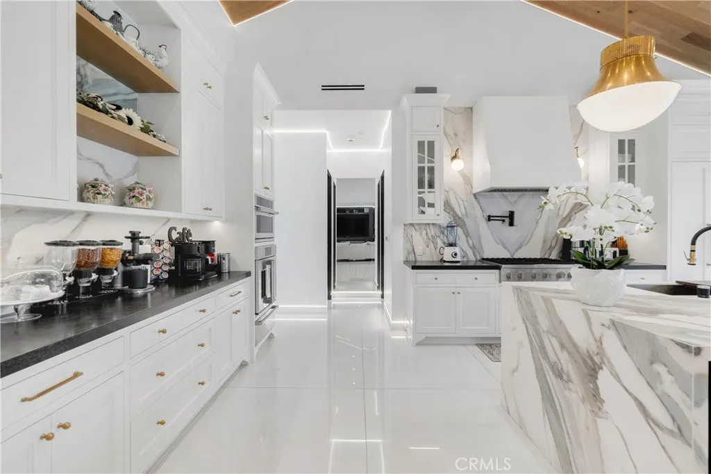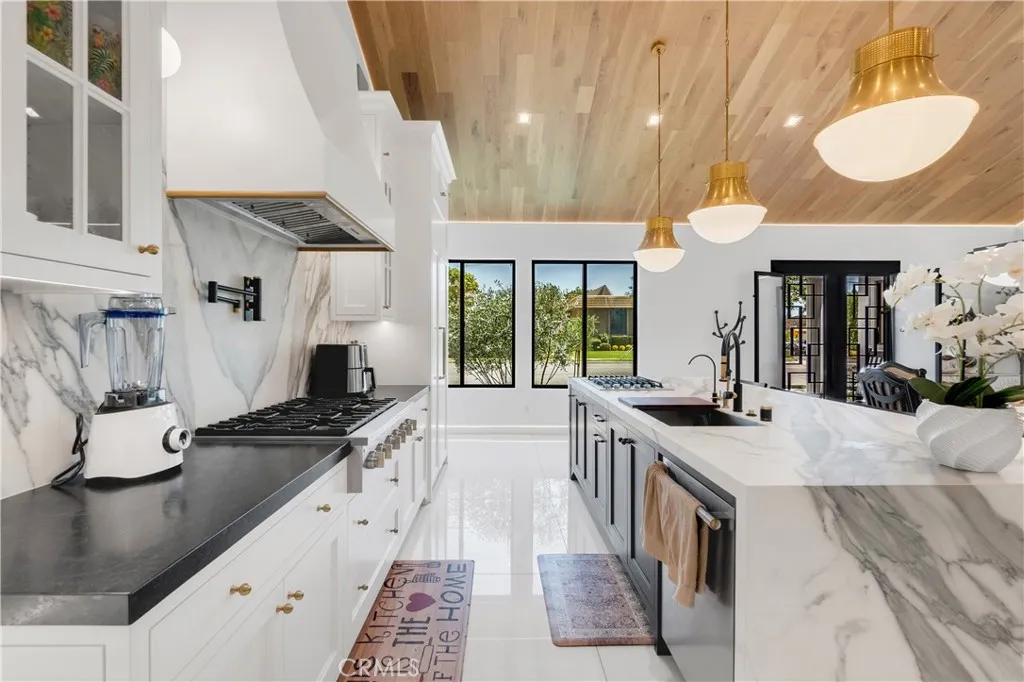 Welcome to this one-of-a-kind, newly built luxury estate nestled in one of Downey's most desirable neighborhoods. Boasting 2,159 square feet of brand-new construction on an oversized 9,529 square foot lot, this exceptional 5-bedroom, 3-bathroom residence offers the perfect blend of timeless elegance and modern design. Every inch of this home was thoughtfully reimagined and constructed from the ground up with no expense spared. Step through grand custom double doors into a light-filled open floor plan featuring dramatic vaulted wood ceilings, oversized porcelain tile flooring, and exquisite LED mood lighting throughout. The designer kitchen is a true showpiece, highlighted by a massive waterfall island wrapped in rich marble, a built-in gas cooktop, custom white cabinetry, double ovens, and a separate coffee bar. Enjoy the convenience of a full bar area with built-in shelving and wine display, ideal for entertaining in style. The elegant dining area flows seamlessly into the spacious living room, complete with a custom black media wall, integrated fireplace, and built-in shelving. Expansive windows and glass doors create the perfect indoor-outdoor experience, leading to the covered patio with custom ceiling design and views of the oversized backyard ready for your dream pool or garden oasis. The home offers five generously sized bedrooms and three spa-like bathrooms featuring floor-to-ceiling marble finishes, walk-in showers with custom stone tile flooring, and luxury vanities. Additional highlights include: Gated private driveway Custom iron double entry doors Designer l