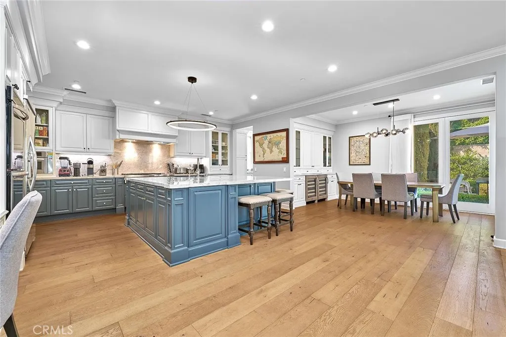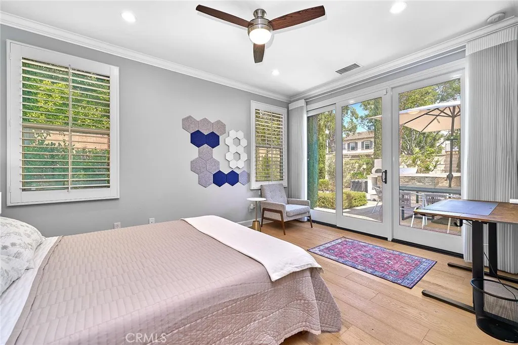 Premium CORNER LOT with a Huge backyard in Woodbury. Dont miss this stunning 4-bedroom, 4.5-bathroom Spanish-style House. This home features 9Kw Solar System, a New Water Treatment System, Wifi Light Switch & Dimmer, Epoxy Garage Floor and Upgraded Garage Cabinets, Hardwood flooring on the main level. The gourmet kitchen is equipped with custom marble countertops, a full backsplash, built-in refrigerator, and flows into a dining room with built-in cabinets and double wine fridges. The great room showcases a cozy fireplace, motorized roller shades, wood shutters, and elegant draperies. Upstairs, you'll find a spacious loft perfect for a home office, study area, or playroom. The primary suite offers dual vanities, a walk-in shower, soaking tub, and a custom-designed walk-in closet. Enjoy the tranquil backyard, with a California Room, built-in BBQ, and a pizza oven. Woodbury offers top-tier amenities including pools, spas, tennis and basketball courts, BBQ areas, parks, playgrounds, and scenic trails. Walking distance to award-winning Woodbury Elementary School, Woodbury Town Center, and several Montessori daycares. This home is 1 min walk to the community pool and spa.