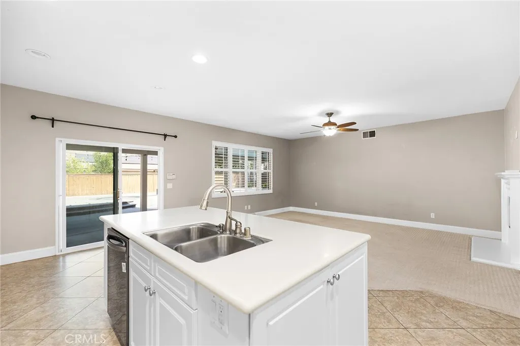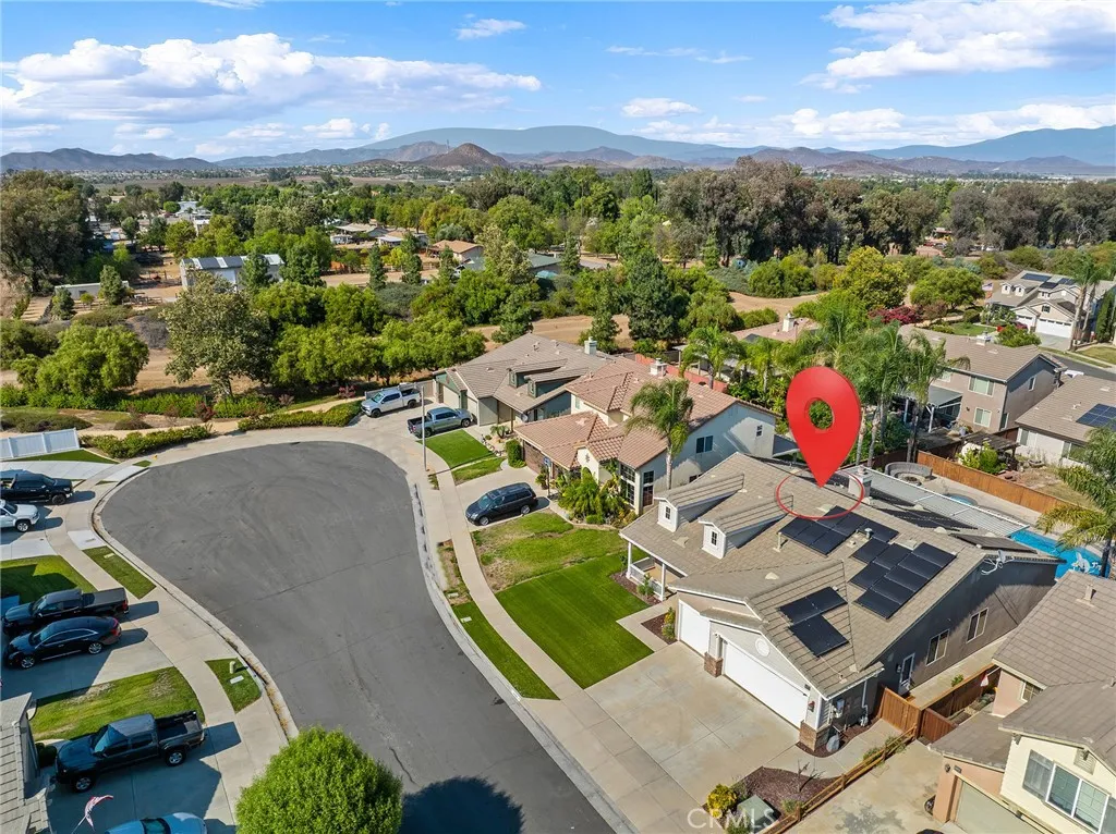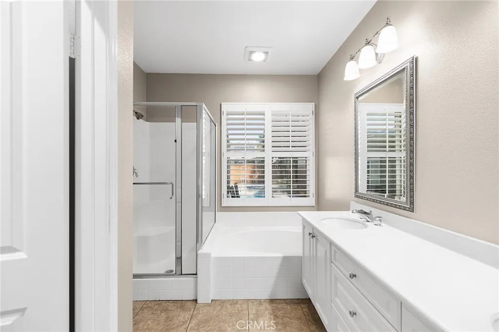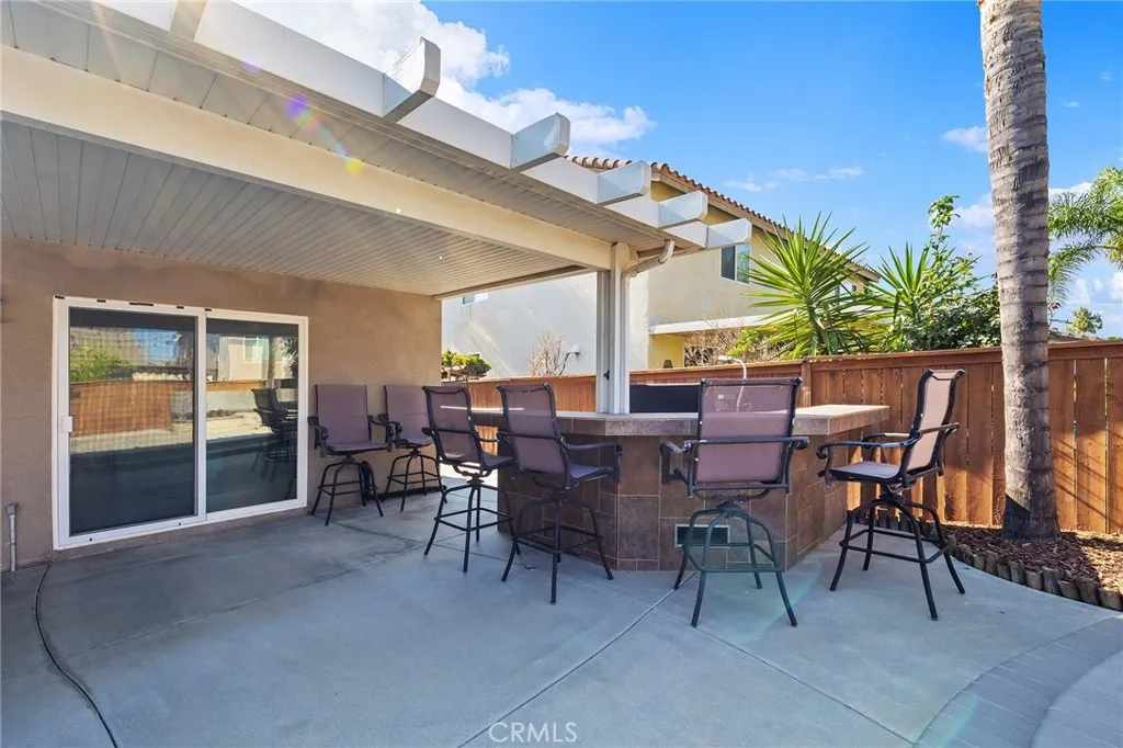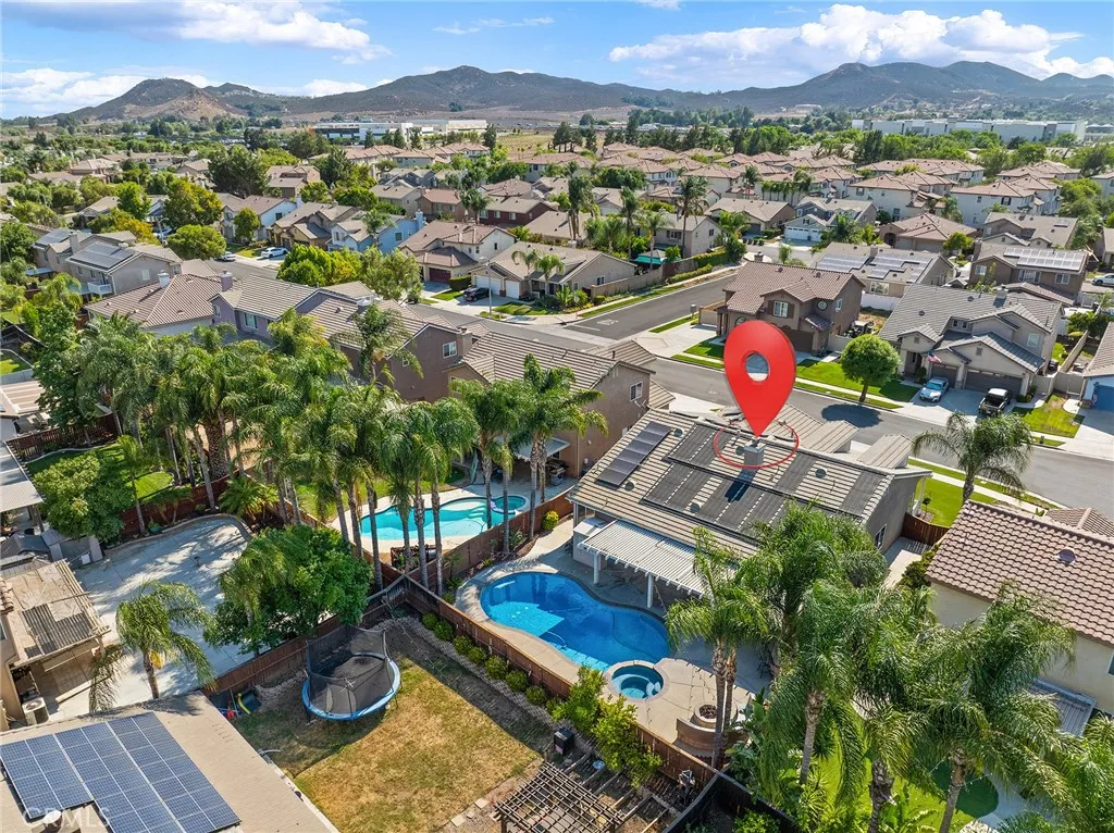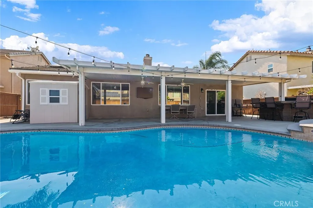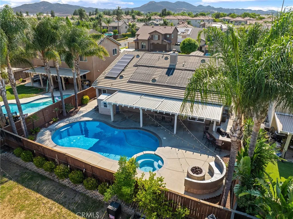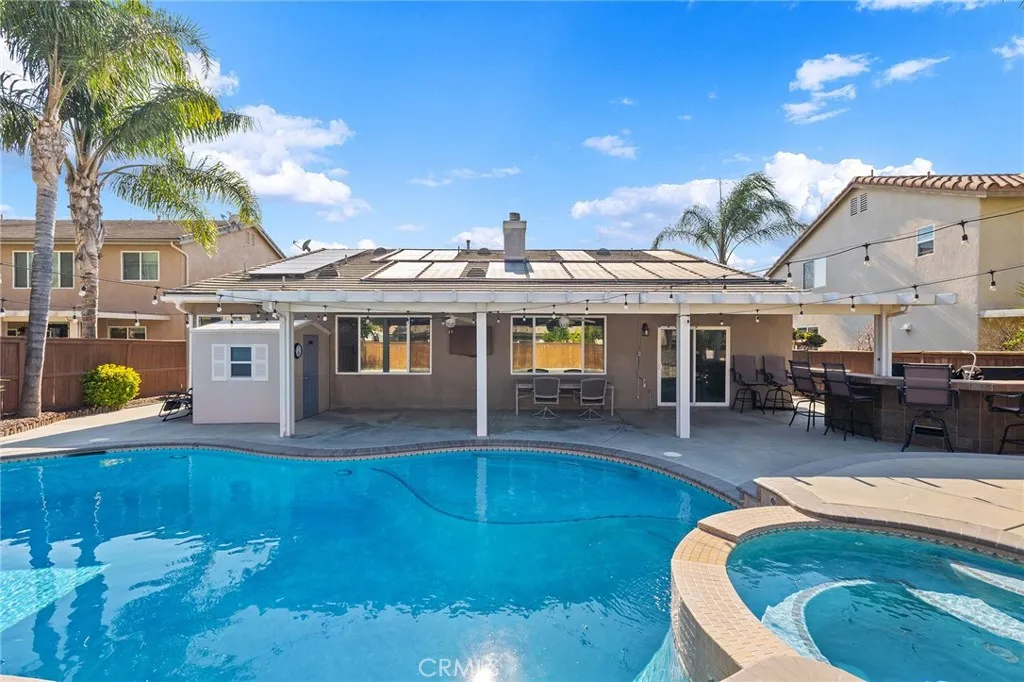 Welcome to this beautifully upgraded, resort-style single-story home nestled in the highly sought-after community of Mapleton. Designed with both comfort and entertaining in mind, the open-concept floor plan offers a spacious family room with a cozy fireplace and a bright, airy kitchen. The kitchen features crisp white cabinetry, stainless steel appliances, recessed lighting, a generous center island with bar seating, and ample storage the perfect space to gather with family and friends. Step outside to your very own backyard oasis, where a sparkling saltwater pool and spa set the stage for unforgettable days and evenings. The outdoor amenities continue with a built-in BBQ island, fire pit with custom concrete seating, and the convenience of a private outdoor bathroom. A covered patio with ceiling fans and beautifully landscaped, low-maintenance grounds including artificial turf in the front yard make outdoor living effortless and enjoyable year-round. Plus, with a dedicated thermal solar system for the pool, you can enjoy warm, heated swims without the extra utility cost. Additional highlights include plantation shutters throughout, custom closet systems, a built-in wine rack, epoxy-coated garage floors, a charming covered front porch, and an a solar system for maximum energy efficiency and savings. The home is also equipped with a whole-house fan, offering quick and efficient cooling while reducing reliance on air conditioning. Ideally located near scenic walking trails, parks, and just minutes from shopping, dining, and freeway access, this single-story home truly has