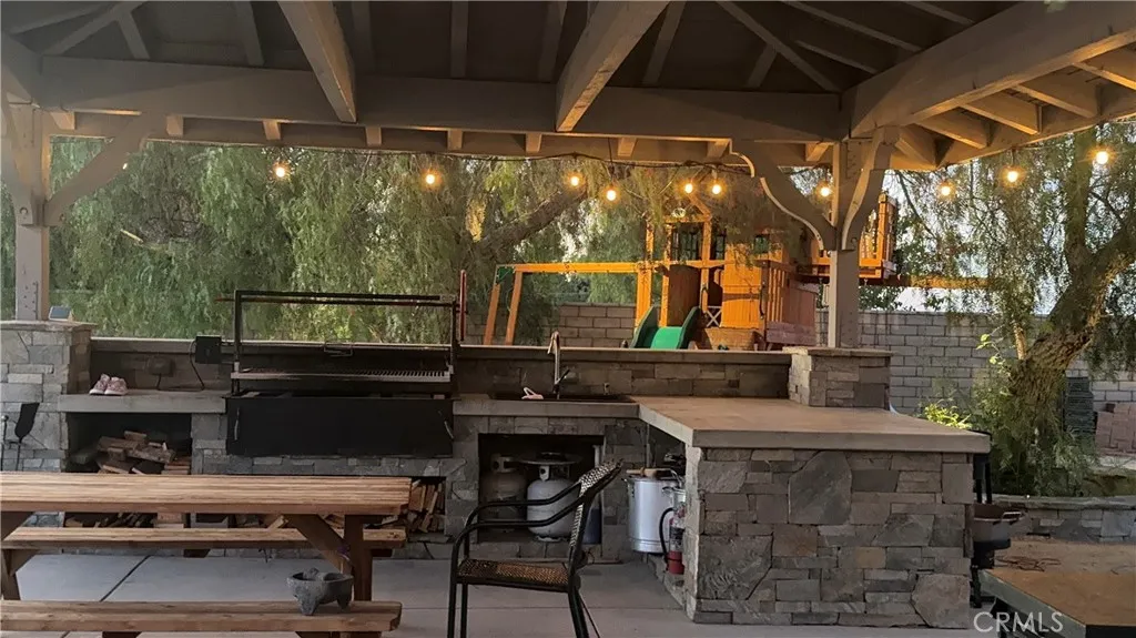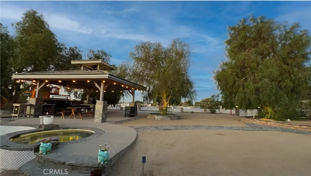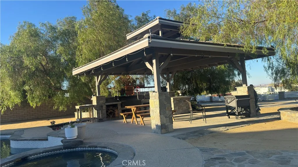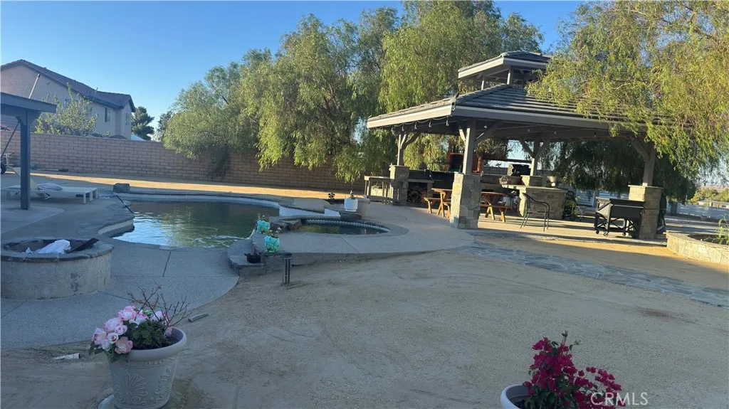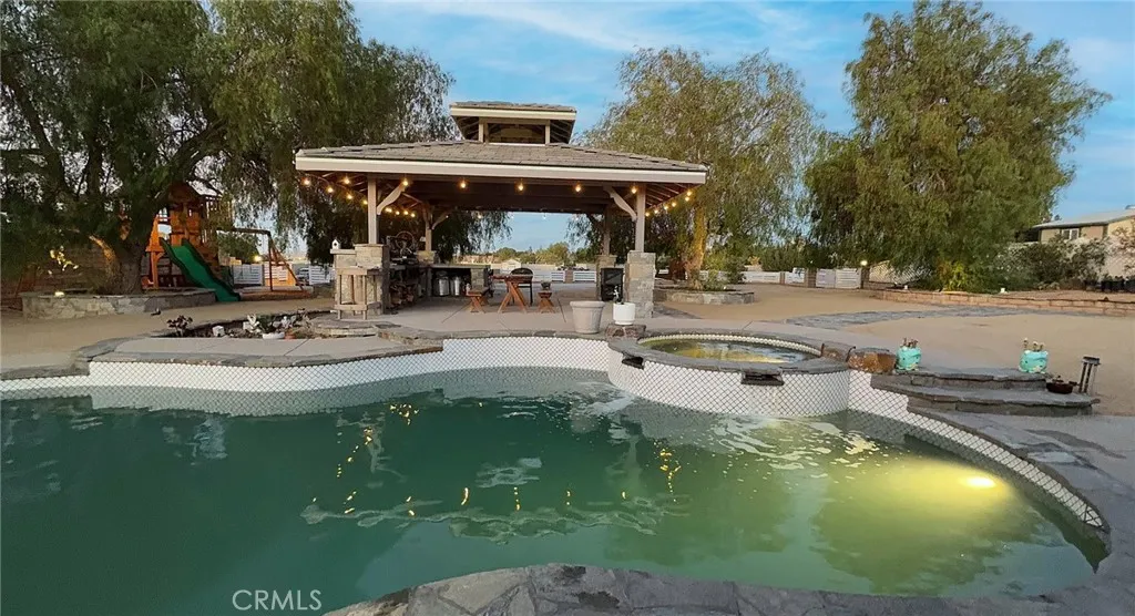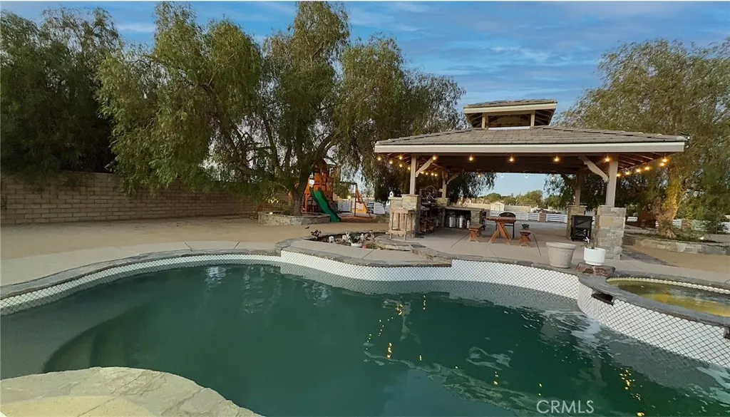 Welcome to this Exceptional almost 1 acre ranch. You will enjoy the luxurious lifestyle that comes with this Excellent opportunity. Plenty of room for large occupancy with these 4 bedrooms 2 bath including a very large primary bedroom with large walk in closet and full artistically done bathroom with double vanity. Beautiful kitchen with quartz countertops that flows very well into the dining room and living room with dual side fireplace. Additionally you will have a very large office space that can be a 5th bedroom, study or quest quarters. Tile Roof, New Heating unit for the HVAC system, upgraded plumbing and electrical, luxury vinyl flooring throughout the house and a fully owned whole house water filtration system. There is a very large driveway that leads into a fully finished 2 car garage with dual garage door to drive into the back yard if so desired. In the immediate yard behind the house you will find a beautiful pool with spa and a custom built outdoor kitchen under an impressive gazebo. This home also comes with a full play ground and a superb large flat rectangular land perfect for your horses and other animals and an additional pigpen/ horse stable in the rear fully equipped with its own drain system to 2 separate septic tanks and running water and power. The property boasts landscape lighting for al the mature trees that produces lots of nice shade and lighting on the steps in to the farthest rear yard, a fire pit. You will also enjoy the view of the city lights at night as well as the view of the Los Angeles National Forest Mountain as your background. The se