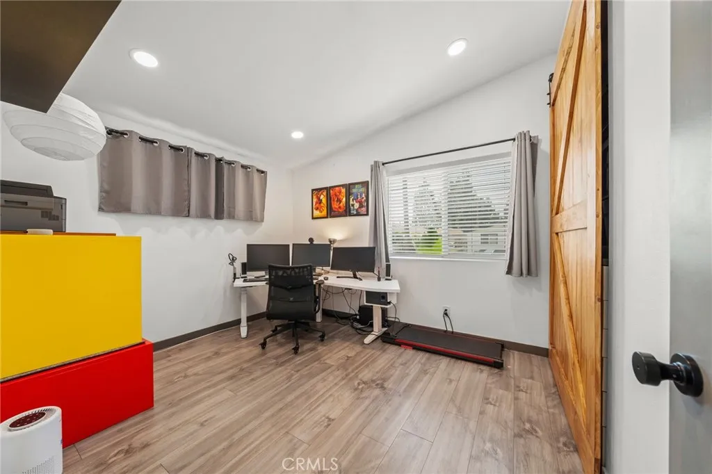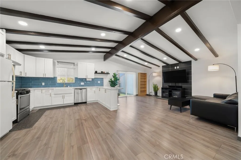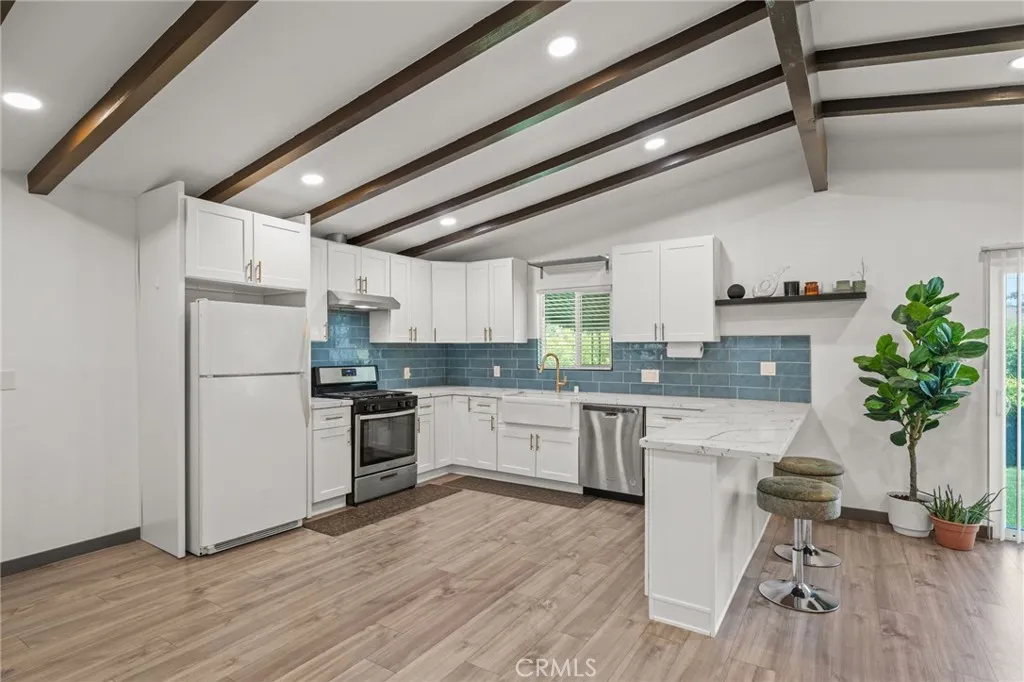 Dont miss this opportunity to own a beautifully-maintained 3-bedroom, 2-bathroom home located in a peaceful cul-de-sac in the heart of Bell. With its open-concept layout, vaulted ceilings, and exposed beams, this home blends character with comfortable living. The spacious kitchen features a stylish blue tile backsplash and flows effortlessly into the living and dining areasperfect for everyday life and entertaining. Central A/C ensures year-round comfort. A permitted garage conversion adds a flexible bonus room ideal for a home office, guest suite, or potential JADU. Prefer a garage? The space can be easily converted back into a two-car setup if desired. Enjoy the privacy of a fully fenced backyard, ideal for relaxing or hosting. The home also includes a covered driveway that fits two SUVs, plus plenty of available street parking. Conveniently located near schools, shopping, and major freeways, this home offers a great combination of location, layout, and value.