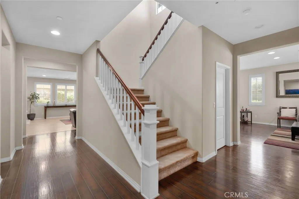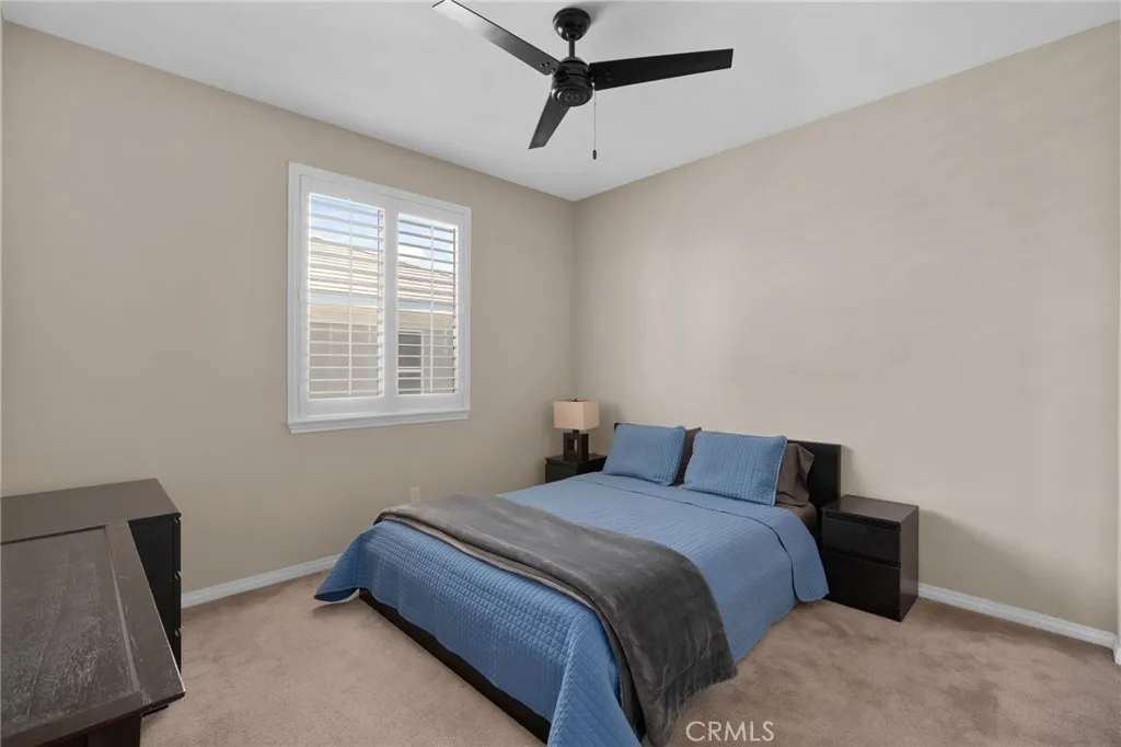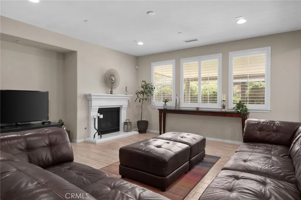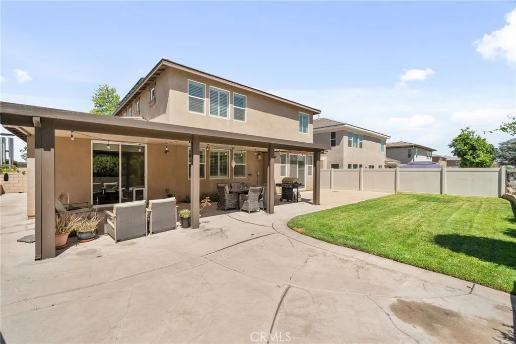 Step into this beautifully maintained Woodcrest home, where lush curb appeal and a charming front porch instantly invite you in. Just beyond the entry, youll find a versatile space perfect as a playroom, office, or dencomplete with doors for added privacy. A formal living or dining room adds to the homes flexibility, while the open rail staircase and plantation shutters throughout create a bright, elegant ambiance. The spacious family room is ideal for relaxing or entertaining, featuring a cozy fireplace, media niche, and seamless flow into the kitchen. The kitchen is a chefs delight with granite counters, a generous island, built-in oven and microwave, a built-in desk area, and a convenient butlers pantry. Sliding doors lead to the serene backyard, offering indoor-outdoor living at its finest. Downstairs features a primary suite is a peaceful retreat with a ceiling fan, sliding doors to the backyard, and an en-suite bathroom featuring a walk-in shower. Upstairs, youll find a second expansive primary suite with dual walk-in closets, a ceiling fan, and a spa-like bathroom with a soaking tub and separate shower. Two additional upstairs bedroomseach with ceiling fans and shuttersshare a dual-sink bathroom. A built-in hallway office nook and a well-appointed laundry room with cabinets, a sink, and a hanging rack complete the upper level. The backyard is a tranquil oasis, showcasing a solid patio cover, a small retaining wall, and beautifully manicured landscapingperfect for outdoor gatherings or quiet evenings at home. This thoughtfully designed home offers space, style, and fu