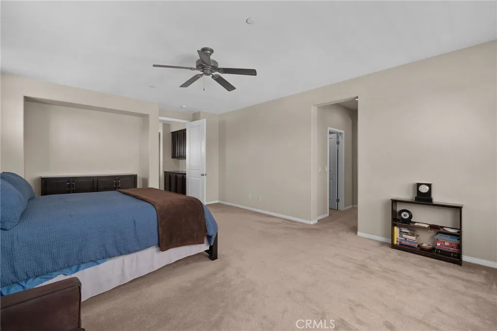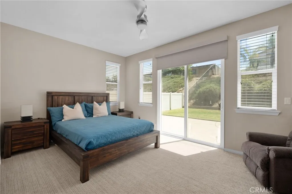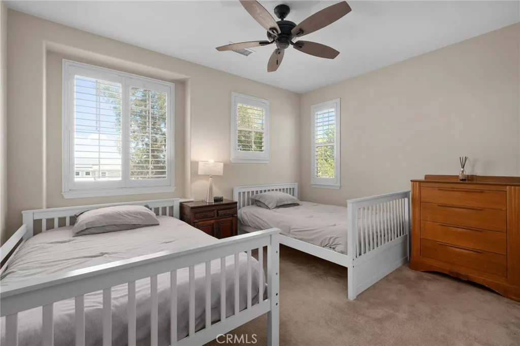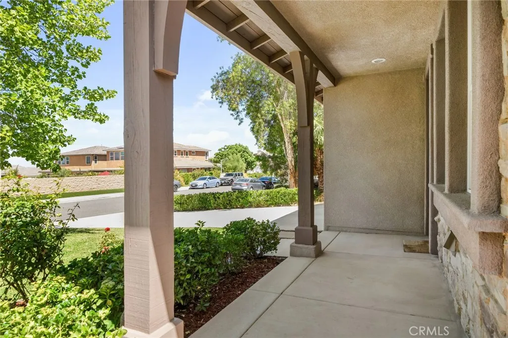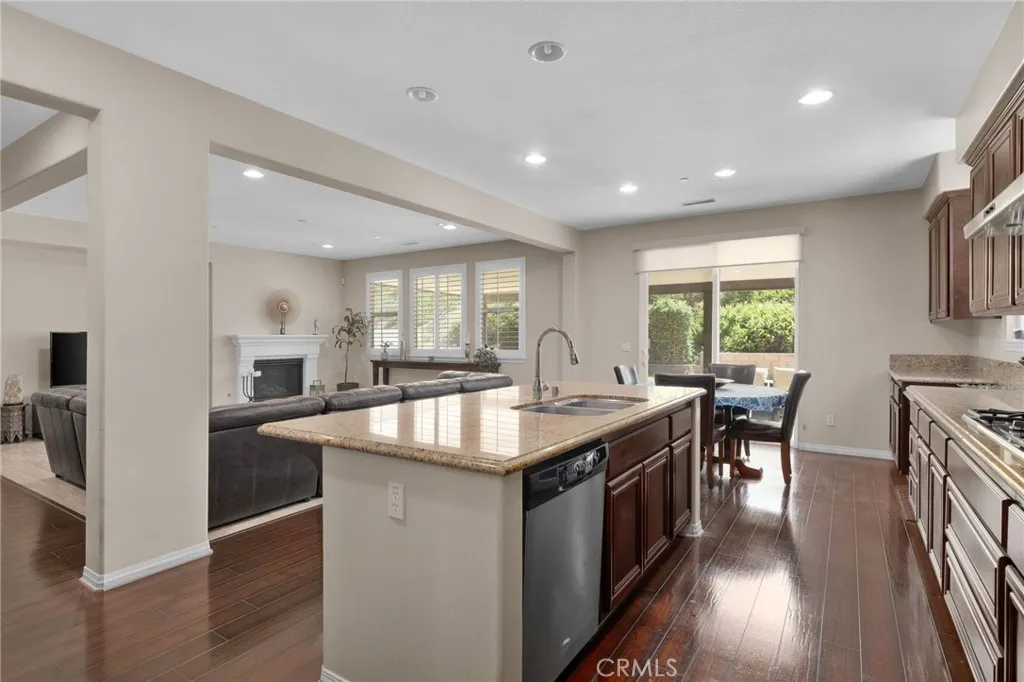 Step into this beautifully maintained Woodcrest home, where lush curb appeal and a charming front porch instantly invite you in. Just beyond the entry, youll find a versatile space perfect as a playroom, office, or dencomplete with doors for added privacy. A formal living or dining room adds to the homes flexibility, while the open rail staircase and plantation shutters throughout create a bright, elegant ambiance. The spacious family room is ideal for relaxing or entertaining, featuring a cozy fireplace, media niche, and seamless flow into the kitchen. The kitchen is a chefs delight with granite counters, a generous island, built-in oven and microwave, a built-in desk area, and a convenient butlers pantry. Sliding doors lead to the serene backyard, offering indoor-outdoor living at its finest. Downstairs features a primary suite is a peaceful retreat with a ceiling fan, sliding doors to the backyard, and an en-suite bathroom featuring a walk-in shower. Upstairs, youll find a second expansive primary suite with dual walk-in closets, a ceiling fan, and a spa-like bathroom with a soaking tub and separate shower. Two additional upstairs bedroomseach with ceiling fans and shuttersshare a dual-sink bathroom. A built-in hallway office nook and a well-appointed laundry room with cabinets, a sink, and a hanging rack complete the upper level. The backyard is a tranquil oasis, showcasing a solid patio cover, a small retaining wall, and beautifully manicured landscapingperfect for outdoor gatherings or quiet evenings at home. This thoughtfully designed home offers space, style, and fu