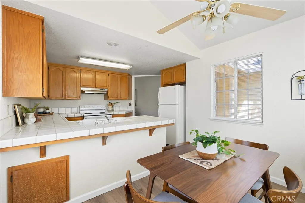 Tucked away in a quiet and welcoming North Chico neighborhood, this delightful home is the perfect blend of charm, comfort, and functionality. With 3 bedrooms, 2 bathrooms, and 1,374 sq. ft. of thoughtfully designed living space, it offers everything you need to feel right at home. Step through the front door and youll be greeted by a bright and open floor plan featuring beautiful laminate flooring, soaring vaulted ceilings, and soft, neutral paint tones that create a warm and inviting atmosphere. The spacious living room is a true focal point, offering plenty of room for gatherings and a cozy brick fireplace that adds a touch of character while making it the perfect place to curl up on cooler evenings. The kitchen is as cute as it is practical, designed to bring out your inner chef. Outfitted with tile countertops, ample cabinetry, a dishwasher, an electric range, and a breakfast bar for quick bites or morning coffee, its a space where function meets charm. Just off the kitchen, the dining area provides the ideal setting for both casual family dinners and more intimate get-togethers with friends. When its time to unwind, the primary suite delivers just the right balance of space and comfort. With its generous layout, nicely sized closet, and private en suite bathroom featuring a large vanity and a walk-in shower, its a peaceful retreat youll look forward to at the end of each day. Two additional guest bedrooms provide plenty of optionswhether you need extra sleeping space, a home office, or a cozy den. Additional highlights include ceiling fans throughout, a separate indoo