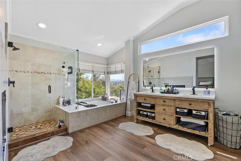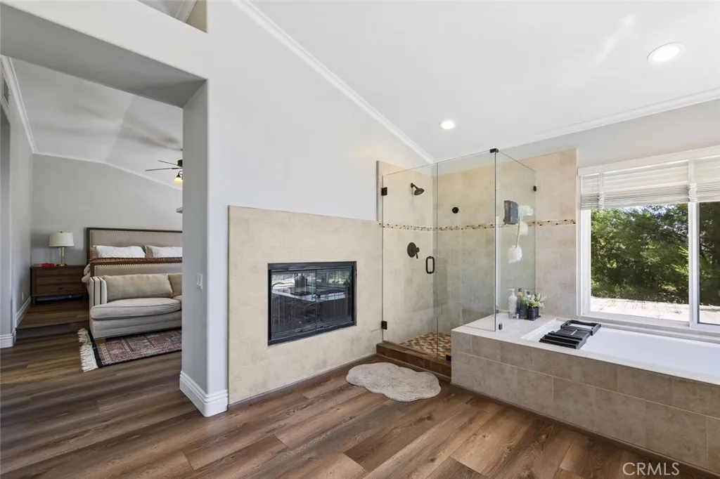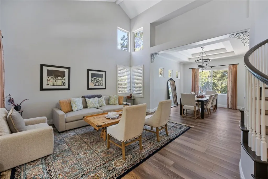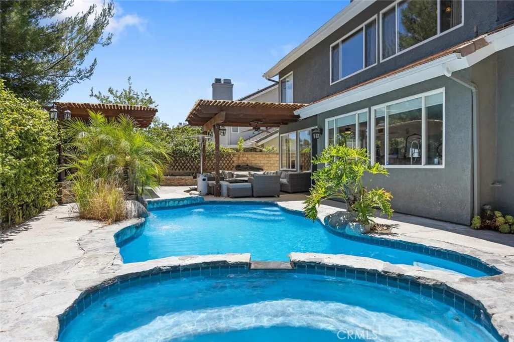 Exquisite Northbridge POOL, SPA and VIEW home on sweeping Flag Lot at the top of a tree lined cul de sac street with OWNED SOLAR! This beautifully upgraded 2 story home features 4 bedrooms and 3 full bathrooms (one on the MAIN FLOOR) plus a 3-car garage with tons of storage and epoxy coated flooring! The soaring cathedral ceilings, regal winding staircase and plethora of picture windows offers abundant natural light leaving a lasting impression upon entering this beautiful home! With neutral, wide luxury vinyl plank flooring, recessed lighting and designer finishes this Valencia home is truly move-in ready! The light and bright living room flows seamlessly into the formal dining area, highlighted by large windows and an elegant chandelier! The heart of the home is the beautifully upgraded kitchen featuring a gorgeous, quartz topped center island with bar seating, stainless steel appliances and glass cabinetry accents! The kitchen conveniently opens to the spacious and inviting family room complete with brick fireplace, wood mantle, crown molding, and ceiling fan! This main living space overlooks the sparkling swimming pool, covered patio and built-in BBQ! The main floor also boasts a huge DOWNSTAIRS BEDROOM AND BATH! Tastefully upgraded with pebble like flooring, glass accents and designer lighting! Adjacent you will find the convenient laundry room complete with utility sink and extra storage leading to the 3 car garage! The entertainers backyard is a true retreat with a sparkling pool and spa, cascading waterfall, covered patio, and a stone bar top complete with built-in