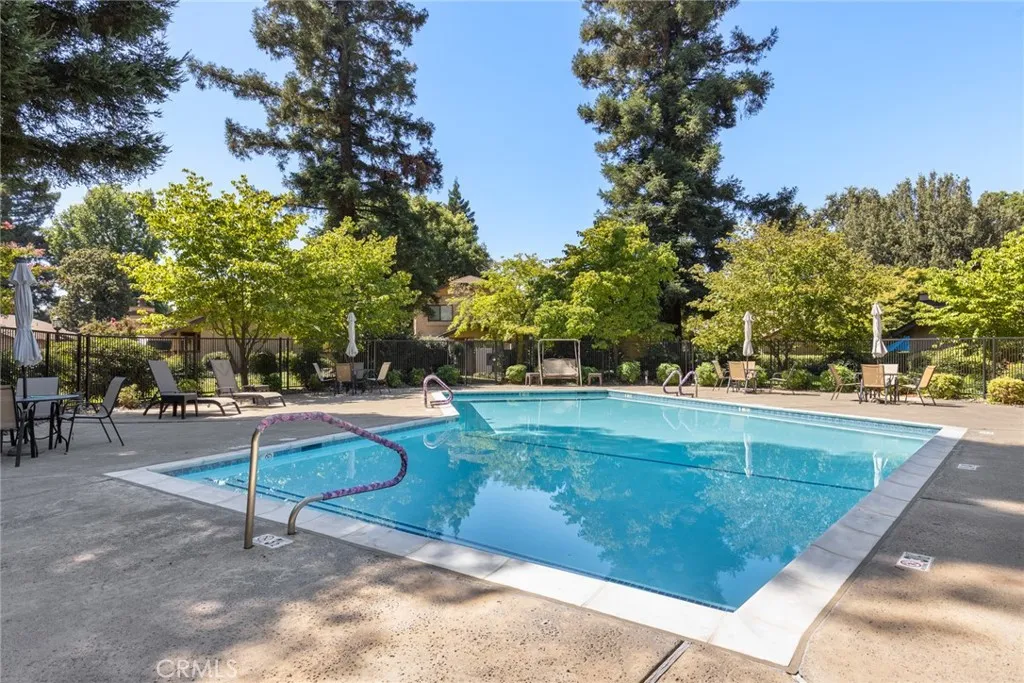 Just location in the complex!! Tucked away in the back of this ever popular neighborhood, this home is just a great place for relaxing on not 1 but 2 different patios !!! Large living room with vaulted ceilings, fireplace and open to dining room with beautiful chandeliers !!! This easy living kind of place has a bonus room that could be used as a 3rd bedroom, office or den. The possibilities are simply just endlesss !! Lots of storage, enjoy the grounds that are taken care of by the HOA, inground pool and all the amenities that are covered, including the roof !!!