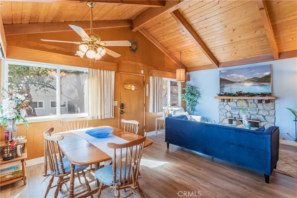 The best LAKE VIEW home in Crestline. It has FULLY FURNISHED with incredible LAKE and mountains VIEW. It offers 2 bedrooms, 2 baths plus a HUGE bonus room. The living room is warm and inviting with vaulted wood beams ceiling, and a wood-burning cozy fireplace. The open-concept kitchen with a bar counter flows seamlessly into the spacious dining area, where large picture windows frame the spectacular lake views. The deck is overlooking 180-degree views of Lake Gregory and mountain. Downstairs, a large bonus/game room and half bath provides excellent potential for guest or it can be use as 3rd bedroom. washer/dryer inside the house. This property is sold fully furnished and is a turn-key, mountain retreat package. Just a minutes from the lake and walking distance to Goodwin & sons supermarket, crestline village, shopping, and restaurants. This is the perfect vacation getaway home with year-round mountain sanctuary.