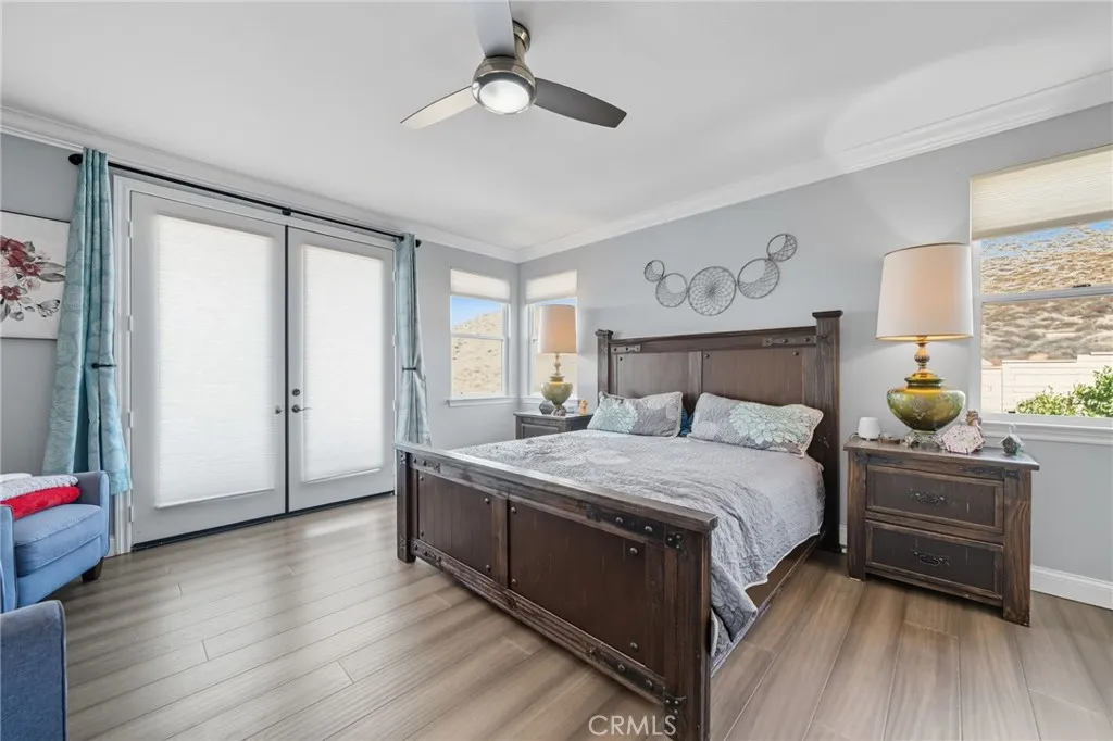 HIGHLY UPGRADED 5 BEDROOM 3 BATH HOME ON AN OVERSIZED LOT WITH BONUS ROOM, SOLAR & NO HOA. Welcome to 27986 Merbie Circle, a beautifully upgraded 5 bedroom, 3 full bathroom, 3,031 sq ft home with a loft upstairs PLUS a large bonus room, ideally located on a quiet cul-de-sac in Menifee. From the moment you enter through the formal living room, youll notice the attention to detail with elegant tile flooring, oversized baseboards, and crown molding throughout the main level. The modern kitchen is a chefs dream, showcasing quartz countertops, a striking stone backsplash, upgraded stainless steel appliances, and an open layout that flows seamlessly to the dining area and family room. Cozy up by the fireplace on cool evenings, or step through the sliding glass doors to your private, drought-tolerant backyardprofessionally landscaped and featuring a built-in gas firepit, perfect for entertaining. The large backyard has space to accommodate a pool, with designs already in place. Downstairs, youll find a full bedroom and upgraded bathroom as well as a laundry room equipped with storage. Upstairs boasts a versatile loft/gaming area AND bonus room. The primary bedroom and retreat offers laminate wood flooring, crown molding, and French doors leading to a private balcony with breathtaking views of the hills, mountains, valley, and twinkling city lights. The spa-like upgraded bathroom includes dual sinks, a sunken tub, a separate shower, and a huge walk-in closet. Three additional spacious bedrooms with mirrored closets and ceiling fans, plus a beautifully upgraded dual-sink bathroom, c