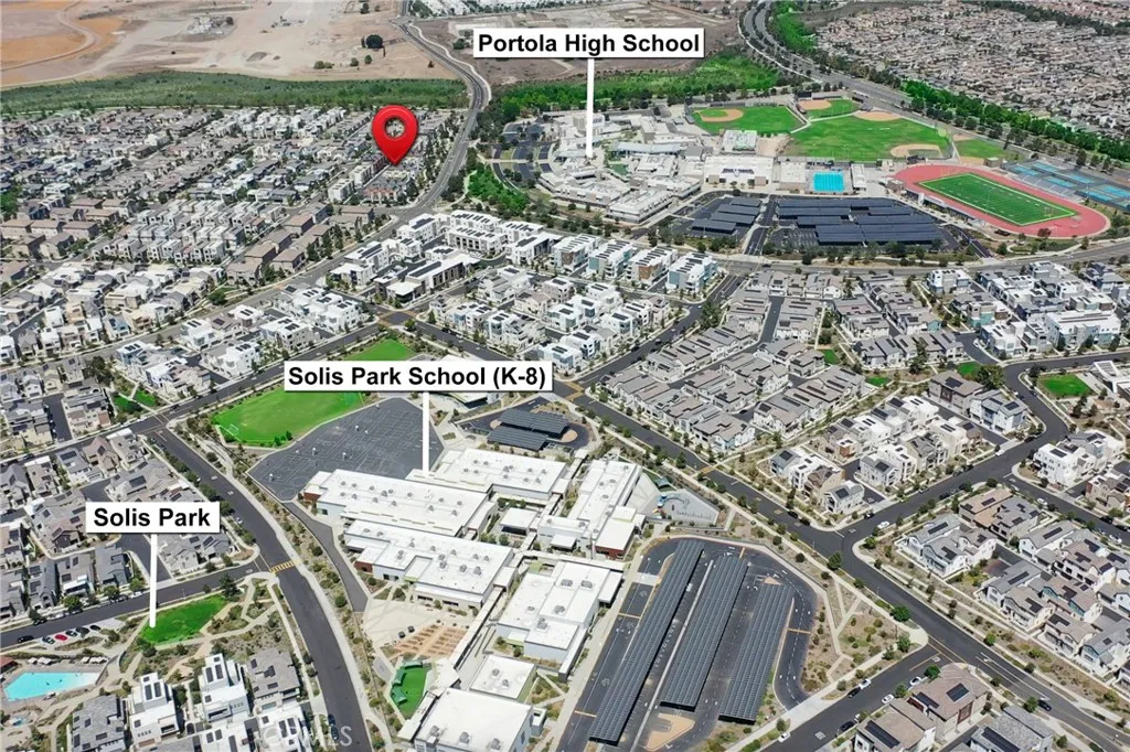 Like-New Luxury Upgraded Turnkey End-Unit Residence in Irvine Great Park NeighborhoodExceptional Value! Just Minutes Walk to top-rated Portola High School and Solis Park School (K8) in the award-winning Irvine Unified School Districtdaily drop-offs are skipped, making life a true breeze for parents. 3 beds, 2.5 baths, and 1,812 sqft of living space. Premium End Unit boasts superior natural light, enhanced privacy, a quieter setting, a larger front yard, and an L-shaped deck. The expansive Open-Concept Layout seamlessly connects the kitchen, living, and dining areas, enhanced by 10-foot ceilings to create a harmonious flow of space. Oversized windows paired with floor-to-ceiling doors bathe the interiors in abundant natural light, accentuating the homes spacious design and luxurious appeal. Tasteful upgrades include whole-house wood flooring, whole-house water softening system, and elegant chandeliers. Stunning primary bedroom suite features a walk-in closet, dual vanity, and a walk-in shower. Two secondary bedrooms are generously sized too. The first floor offers ample storage closets and direct access to a side-by-side 2-car garage. Energy-saving features include leased solar system, EV charger pre-wire, energy-efficient windows,and tankless water heater. Just minutes from Woodbury Town Center, Irvine Spectrum Center, and Kaiser Permanente, etc. Enjoy Great Parks world-class recreational amenities and the state-of-the-art sports complex, with easy access to I-5, 133, 405, and 241. Only 1825 minutes drive to Newport Beach and Laguna Beach. This is a place waiting to belong.