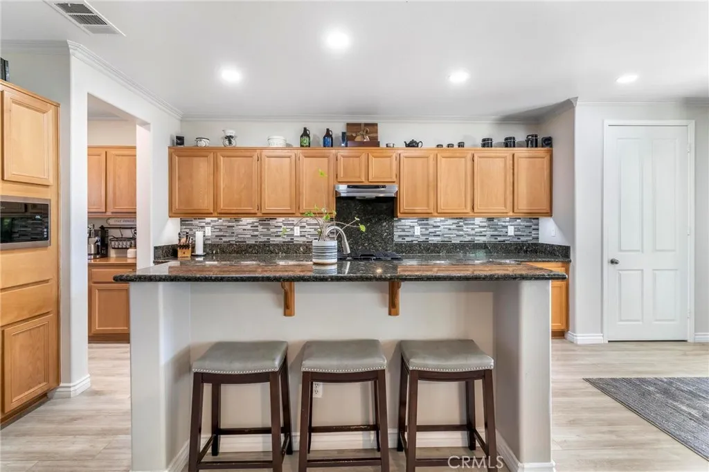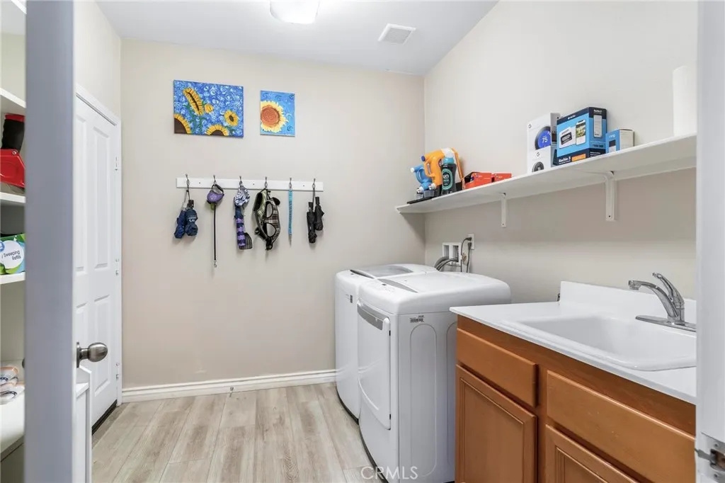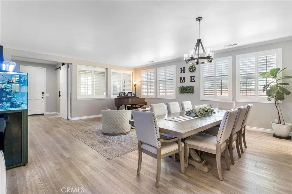 Beautifully upgraded single-story home offering 4 bedrooms, 3 bathrooms, plus an office that can easily serve as a 5th bedroom. From the moment you walk in, youll notice the vaulted ceilings, laminate flooring throughout, dual-pane windows, and custom shutters that bring in natural light and style. The spacious floor plan includes a large living area with sliding glass doors leading to the backyard, a kitchen with a double oven and ample storage, and a convenient indoor laundry room. The primary suite is a retreat of its own with direct patio access, a huge walk-in closet, and abundant storage. This home also features a 3-car garage with RV potential, providing plenty of parking and flexibility for toys or work vehicles. The backyard is designed for both enjoyment and function with a covered patio, two peach trees, one plum tree, and multiple citrus trees, all surrounded by colorful flowers in the front and back. Located in the desirable Sundance Community Association, this property offers a low HOA and a 1.8% tax rate, plus no solarso no payment to absorb. A rare combination of upgrades, functionality, and outdoor charm in a well-maintained communityready to welcome its next owner.