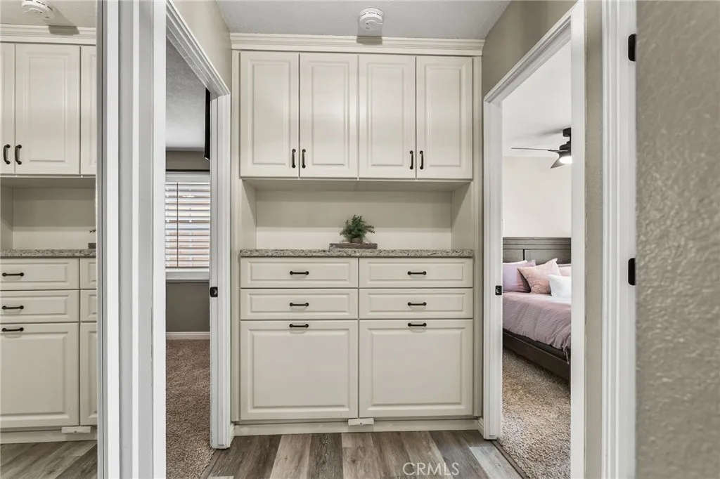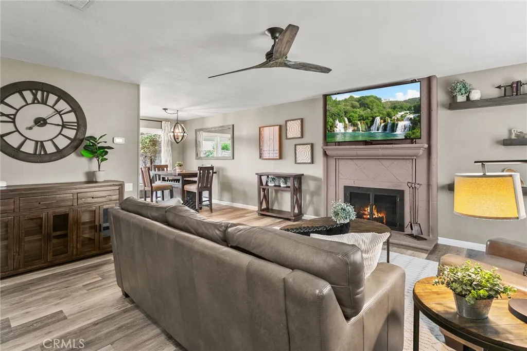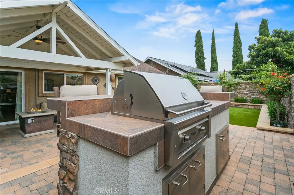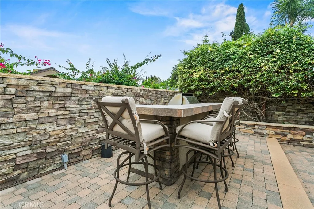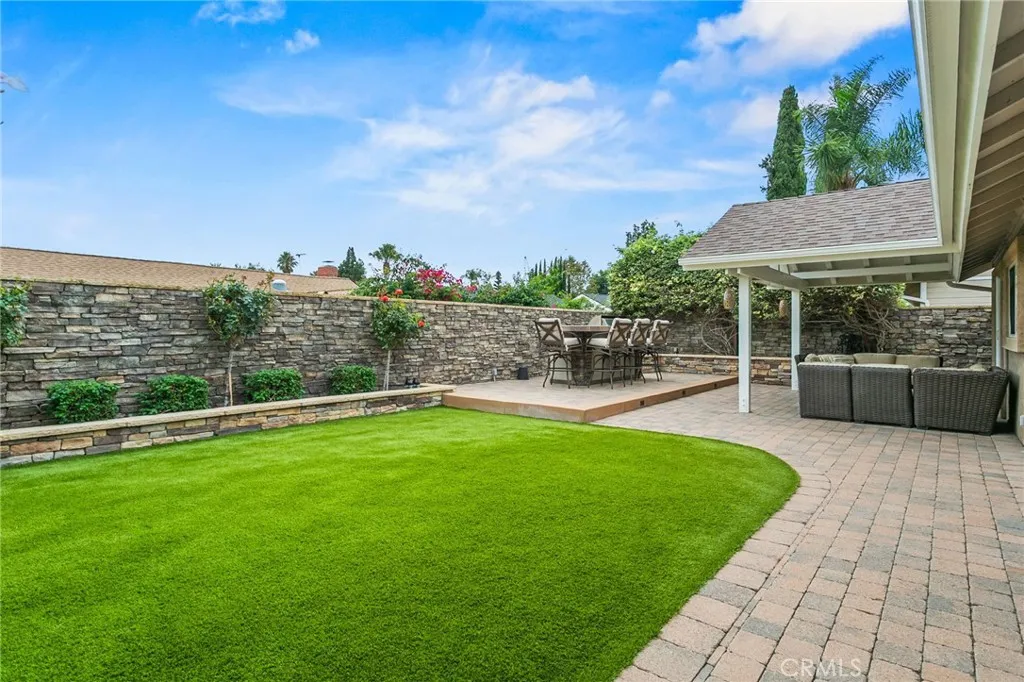 Tucked within a quiet cul-de-sac in the desirable Laguna Terrace community, this 3-bedroom, 2-bath home is clean, updated, and truly move-in ready. With a spacious 5,000 SQFT LOT and smart upgrades inside and out, it offers a seamless blend of indoor comfort and outdoor enjoyment. The first thing you'll notice is the incredible CURB APPEAL: lush landscaping, CONCRETE PAVER DRIVEWAY, and a charming front porch welcome you home. Inside, the OPEN FLOOR PLAN features durable LVP FLOORING throughout the main living areas, MODERN CEILING FANS, and recessed lighting. The living and dining rooms flow together effortlessly, with a DESIGNER LIGHT FIXTURE over the dining space and sliding doors that open to one of the homes best surprises... the BACKYARD! Designed with entertaining in mind, the backyard features CONCRETE PAVERS, a BUILT-IN BBQ AND BAR, a COVERED PATIO with a CEILING FAN, low-maintenance TURF, and STACKED STONE WALLS surrounded by mature hedges for added privacy. Its the perfect space to relax or host friends. Back inside, the kitchen is fresh and functional with WHITE CABINETRY, STAINLESS STEEL APPLIANCES, GRANITE COUNTERS, and a large window above the sink that brings in natural light. The hallway houses an INDOOR LAUNDRY AREA with full-sized hookups and leads to all three bedrooms. The spacious primary suite is cozy and inviting with plush carpet, a ceiling fan, two-tone paint, and a stylish BARN DOOR opening to the ensuite bath. Inside, youll find a WHITE SHAKER VANITY, QUARTZ COUNTERS, and a FLOOR-TO-CEILING SUBWAY TILE SHOWER with modern fixtures. Two additional