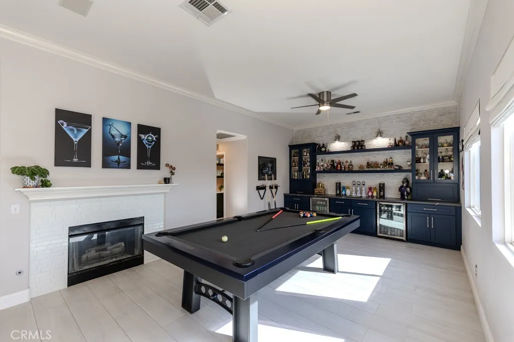 Step into modern sophistication. This luxurious 5 bedroom 3 bathroom home will satisfy all of your expectations. Upon entering, you will immediately notice the open floor plan, crown molding, windows that offer natural lighting, seamless tile flooring, office space, and the pleasing neutral color scheme. The kitchen is bold yet elegant. The CAFE brand appliances are both smart and Wi-Fi operative, dressed with gold fixtures, equipped to bring your culinary experience to another level. The cabinetry provides an abundance of storage, there is a pantry, and even your very own coffee bar! In the game/pool table area you will find a dry bar with 2 refrigerators, shelving, and additional cabinet space for storing snacks and goodies to offer your guests. Head upstairs to find a loft area along with 4 bedrooms that have carpet throughout. The main bedroom suite is a couples' dream with a fireplace, more windows for extra natural light, his/hers closets, and space space space!!! If that wasn't enough, wander back downstairs and enrapture yourself into the backyard oasis. The beach entry pool is surrounded by palm trees galore, tropical greenery, and a built-in BBQ with seating is nestled into the corner of the yard for added entertainment. There is a firepit, spa, and covered seating area with a ceiling fan to top off your hosting showcase. Solar is fully paid off. Walking distance from Lake Mathews Elementary. Close to shopping, Tyler Mall, and Dos Lagos. This dwelling can only truly be appreciated in-person. We invite you to visit before it's captured!!!