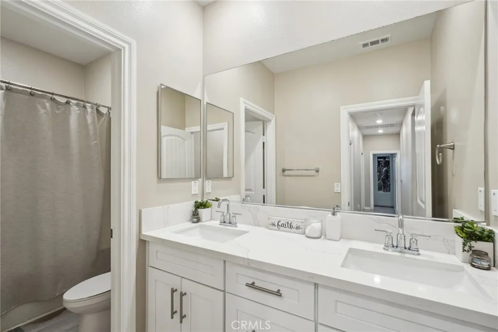 Spacious, like-new home, built in 2023, offers Owned Solar Panels, as well as great curb appeal with low maintenance landscaping! The interior offers high ceilings, an open floorplan, recessed lights, vinyl plank floors, and a neutral paint scheme. The kitchen features quartz counters, a center island with breakfast bar seating, white cabinetry, a pantry, and stainless steel appliances. The kitchen overlooks the great room with living and dining area. The huge primary suite has a spa-like ensuite with dual sinks, a soaking tub, a separate shower, and a walk-in closet. Three of the secondary bedrooms sit in a cluster to the left of the main entry hall and share a full-size bathroom with dual sink vanity at the end of the hallway, and there is a 5th bedroom on the right side off of the entry hall also with a full-size bathroom, great for multi-generational living. Enjoy the private, no maintenance backyard with rockscaping and covered patio with built-in lighting, this space is ready for the new owner's design! This home also has an attached 2-car garage, and is conveniently located near schools, shopping, dining, the 215 Fwy, and No HOA! Don't wait, schedule your tour today!