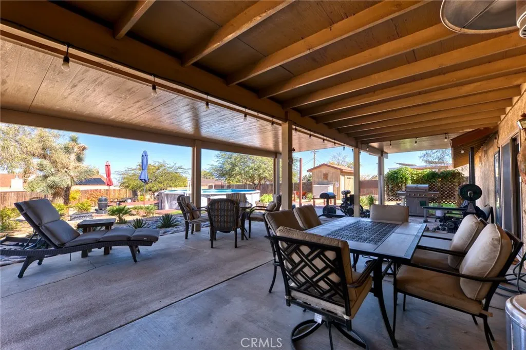 Welcome to this beautifully maintained 3-bedroom, 2-bath home nestled in the desirable Sky Harbor neighborhood of Yucca Valley, a peaceful, upscale pocket known for its wide streets, pride of ownership, and proximity to both town conveniences and Joshua Tree National Park. Spanning 1,690 square feet, this residence has been lovingly cared for and thoughtfully updated, offering comfort, style, and functionality in every detail. From the moment you step through the entryway, a mosaic tile inlay sets an elegant tone. The home features oversized ceramic tile floors in the kitchen and halls, new carpet and padding in the living areas and bedrooms, and a new HVAC system with upgraded ducting for year-round comfort. The spacious living room welcomes you with vaulted ceilings, abundant southern natural light, and a stone-faced fireplace with a new pellet insert and blower, the perfect centerpiece for cozy evenings. The expansive kitchen is a chefs dream, offering solid honey oak cabinetry, stainless steel appliances including a double oven, a glass tile backsplash, and a sink overlooking the backyard. With an eat-up breakfast bar and a walk-in pantry, theres no shortage of storage or counter space. A dining area just off the kitchen opens through new sliding glass doors to the backyard, creating a seamless indoor-outdoor flow ideal for entertaining. The guest bathroom features a long vanity with ample counter space, a shower/tub combo, and designer glass tile backsplash reaching to the ceiling. Both guest bedrooms are generously sized with ceiling fans, new carpet, and great natura