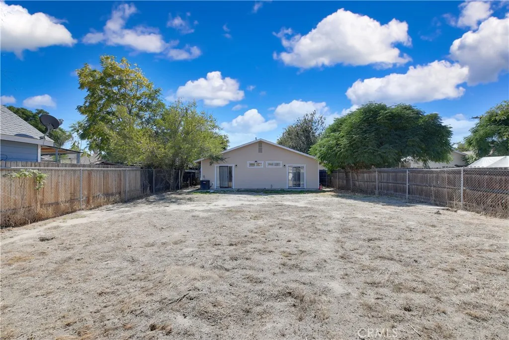 Welcome to this charming single story Hemet home with great potential! This 3 bedroom, 2 bathroom 1046 square foot single story home built in 2003 sits on a generous fully fenced 7841 square foot lot, providing plenty of space and convenience. Featuring an attached 2 car garage and an extended dirt on the side of the driveway area perfect for potential RV parking, this residence combines comfort with practicality. Upon entering, you will be greeted by an abundance of natural light that fills the home. The tile floors and natural light create a warm atmosphere throughout. As you enter, a versatile space awaits, perfect for use as a family room or living area. The kitchen offers a blank slate for your renovation ideas. It opens directly to the dining area with a door for direct garage access, creating a connected and functional layout, and features tile flooring throughout. The hallway bathroom features a shower/tub combo, single sink vanity, and tile flooring. The spacious master bedroom impresses with wood plank flooring, a closet, a ceiling fan, and a sliding glass door leading to the backyard. The master also includes an attached bathroom with a shower/tub combo, single sink vanity, and tile flooring. The additional bedroom offers wood flooring, ceiling fans and generous closet space. The expansive outdoor area serves as a blank canvas for your landscaping preferences, providing plenty of space in both the rear and side yards to add your personal touch. The property features concrete patio, perfect for relaxing or entertaining guests. Whether you envision a garden, a spac