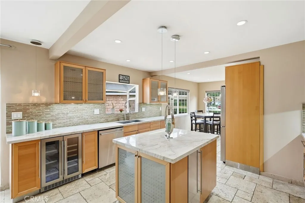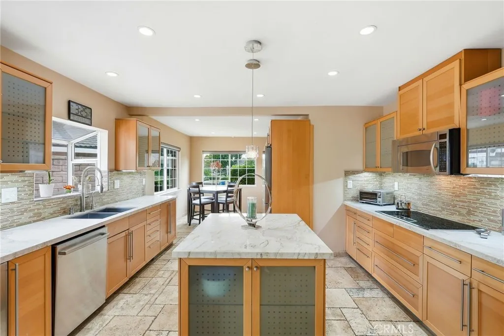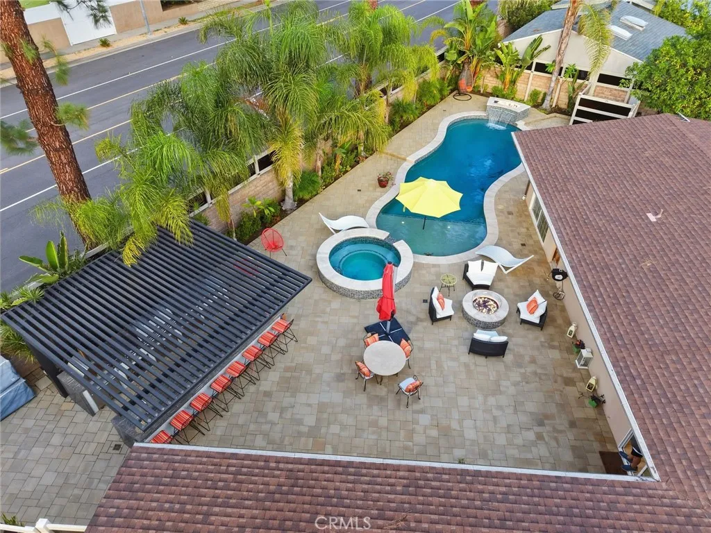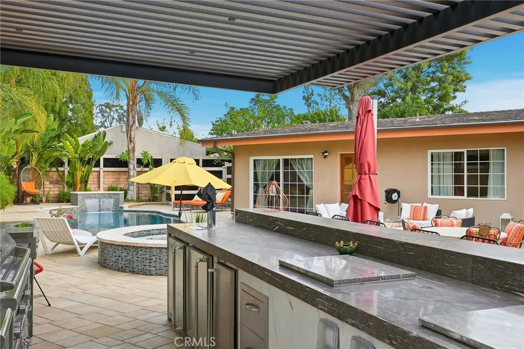 Experience modern California living at its finest with a seamless blend of traditional charm and contemporary design. From the moment you arrive, the striking black entry doors set the tone, highlighting the contrast between the classic single-story main residence and the sleek two-story ADU. The main residence offers 2,011 sq ft with 3 bedrooms and 2 bathrooms and features a bright open layout with elegant updates throughout and an enclosed patio of roughly 200 sq ft. The spacious living and dining areas flow into the remodeled kitchen with quartz countertops, custom cabinetry, stainless-steel appliances, and a large breakfast bar ideal for gatherings. A gas fireplace adds warmth to the main living space. The serene primary suite offers a walk-in closet and an updated en-suite bath overlooking the pool. Additional bedrooms provide versatility for guests, family, or a home office. A hallway laundry area with cabinetry adds convenience. Upgrades include paid solar, updated electrical, a tankless water heater, EV charger, a newer roof, and a recently replastered pool, offering comfort, reliability, and efficiency. The outdoor space is an entertainers retreat with a sparkling pool and waterfall wall, modern firepit lounge, second firepit, and an expansive covered patio with a full outdoor kitchen equipped with a pizza oven, charcoal grill, refrigerator, freezer, beer tap, beverage bar, sink, and ample seating. A storage area with a shed and an outdoor shower add practicality. The side yard includes a third firepit, mature fruit trees, and space ideal for storage or potential J