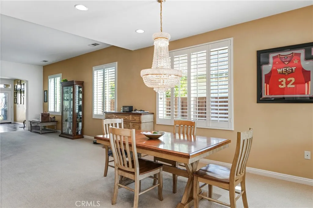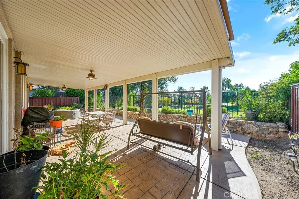 Welcome to Four Seasons Hemet! This Beautiful 3 Bedroom 2 Bath, 2024 Square foot home sits right on the scenic 18th fairway! This beautifully maintained home offers one of the most peaceful and desirable golf-course settings in all of Four Seasons Hemet. A bright open floor plan, and modern energy upgrades including solar and battery backup, this home blends comfort, efficiency, and resort-style living. Inside, the layout flows effortlessly from the spacious living room to the dining area and kitchen, creating an ideal environment for entertaining or relaxing. The kitchen features warm caramel cabinetry, stainless steel appliances and a view that opens toward the backyard and golf course. Plantation shutters, and soft indirect lighting add to the elegant, inviting feel throughout the home. The primary suite is a true retreat, with French doors that open directly to the serene golf-course view. The ensuite bath includes a Jacuzzi soaking tub, upgraded cabinetry with dramatic granite counters, and dual walk-in closets. Two additional bedrooms lightly lived in and flexible for guests, office use, or hobbies provide valuable versatility. Outside, a large alumawood covered patio spans the back of the home, offering shaded comfort all day long while you take in the sweeping views of the fairway, mature shade trees, and colorful rock-wall landscaping. Its the perfect spot for morning coffee, afternoons with friends, or simply unwinding in the evening breeze. A spacious two-car garage with golf-cart parking and charging capability completes this exceptional home. Residents of Fo