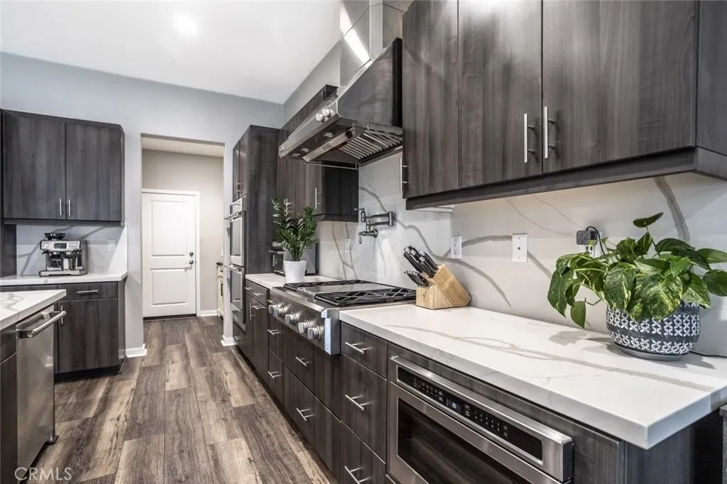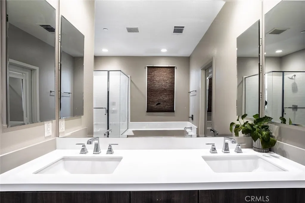 Beautifully maintained two story home in a desirable Santa Clarita neighborhood offering approximately 2,932 square feet on a 6,223 square foot lot. The home features 4 bedrooms, a bonus room that may serve as an additional bedroom, and 3 bathrooms. There are two primary bedrooms with attached bathrooms, one located downstairs and one upstairs, providing flexibility for multigenerational living or guests. The open floor plan is filled with natural light and showcases wide plank flooring, spacious living and dining areas, and a well appointed kitchen with modern cabinetry, generous counter space, a large center island, and stainless steel appliances. Living areas connect comfortably to the backyard for indoor outdoor enjoyment. The private backyard includes a covered patio and landscaped lawn. A two car attached garage provides parking and storage. Skyline community amenities include a pool, spa and hot tub, fire pit, barbecue area, sport court, tennis court, biking and hiking trails, guest house, pool house, clubhouse, recreation room, and maintained grounds. Conveniently located near parks, schools, shopping, dining, and major access routes.