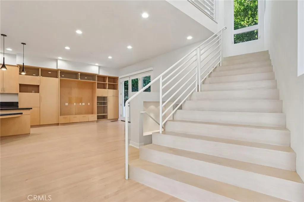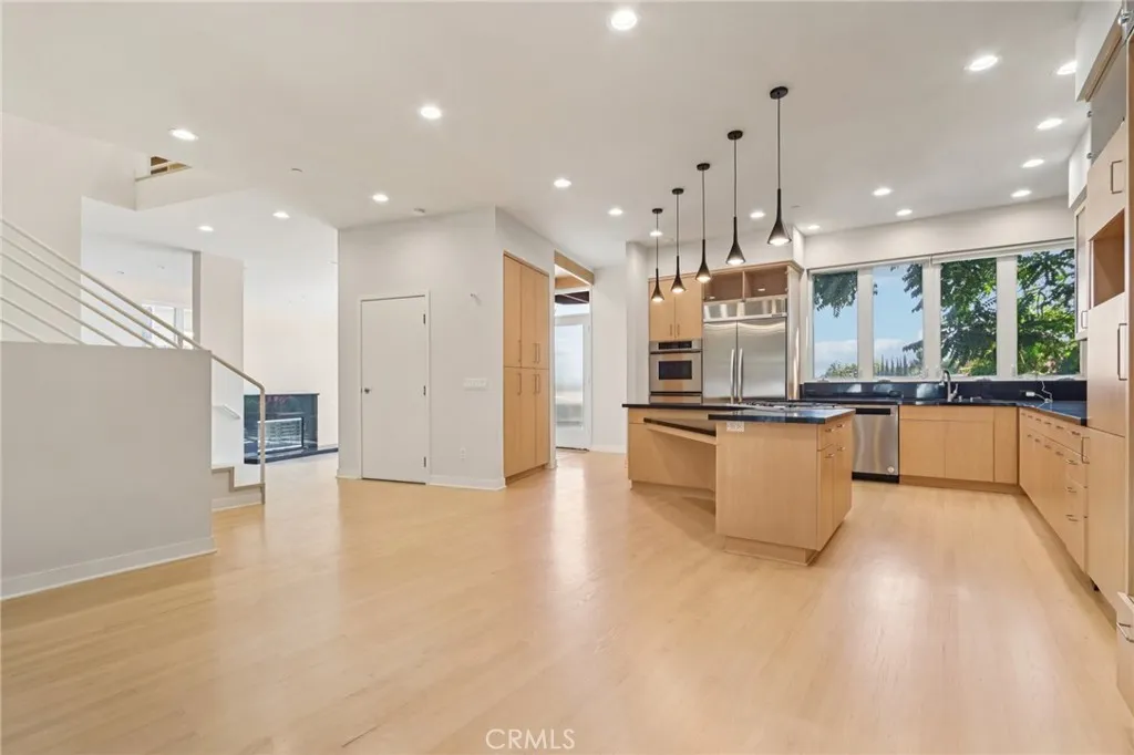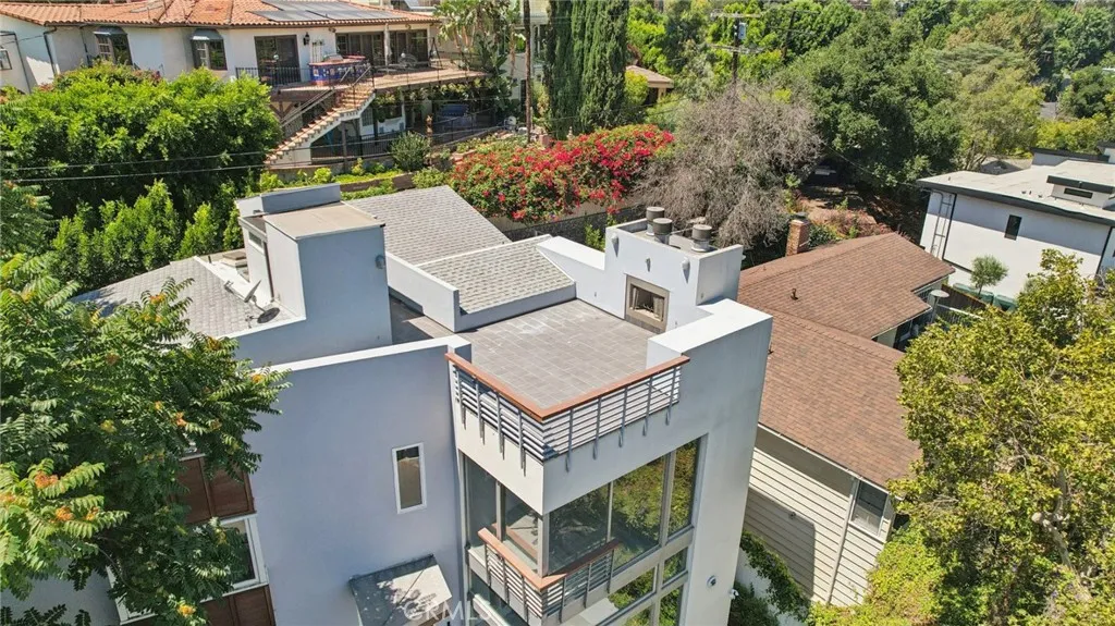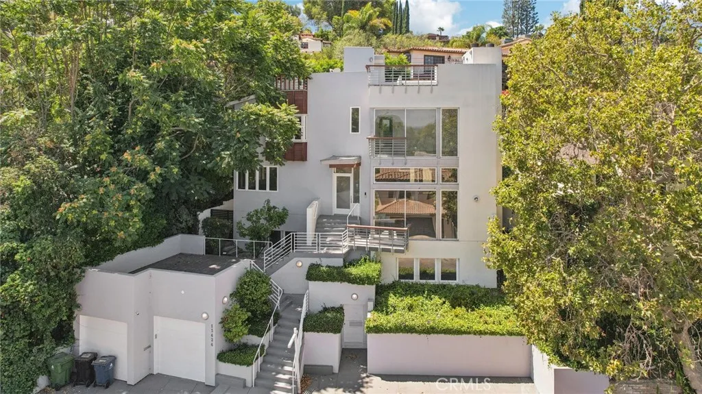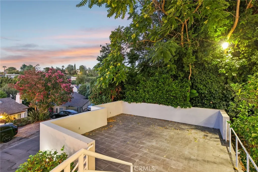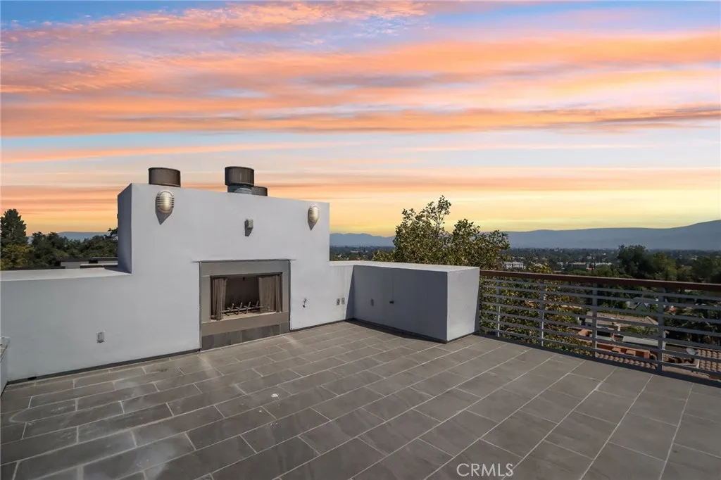 Welcome to this contemporary hideaway nestled south of Ventura Boulevard on a picturesque, tree-lined street in coveted Sherman Oaks. A striking architectural facade with geometric glass panels sets the stage for the light-filled interior, where floor-to-ceiling windows bathe the formal living and dining areas in California light, highlighted by an onyx fireplace and custom built-ins. The open-plan kitchen features stainless-steel appliances, abundant cabinetry, and a central island with a cooktop, flowing effortlessly into the family room, which opens via French doors to outdoor entertaining spaces. A private elevator connects all levels, leading to a generous rooftop deck with sweeping 360-degree views of the Valley, city lights, mountains, and treetops. The voluminous primary suite includes its own fireplace, Juliet balcony, spa-inspired bath, and walk-in closet. Secondary bedrooms are bright and spacious, and one has been thoughtfully appointed as a gym with mirrored walls and rubber flooring. Moments from Ventura Boulevards shops and dining, and located within the top-rated Dixie Canyon Community Charter district, this home embodies sophisticated hillside living with convenience and style.