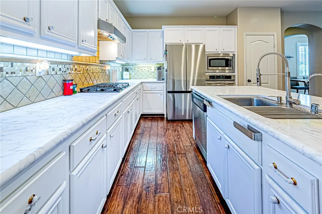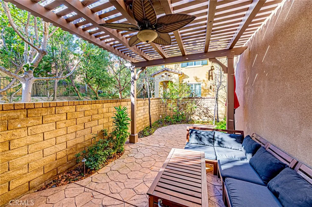 BOM. Immaculate and gorgeous Valencia home featuring 3 bedrooms and 2.5 bathrooms, located within the highly desirable Westridge community. This home offers exceptional privacy, tucked away in a scenic and ultra-quiet neighborhood while still providing convenient access to freeways, shopping centers, and restaurants just minutes awaytruly the best of both worlds. This beautiful residence boasts a bright and open floor plan with distressed real hardwood flooring throughout the downstairs, custom interior paint, and abundant natural light. The upgraded kitchen features a center island, stainless steel appliances, full decorative backsplash, food pantry, and ample cabinetry. Additional highlights include recessed lighting, plantation shutters, ceiling fans, and many tasteful upgrades throughout. The dining area opens seamlessly to the spacious family room with a cozy fireplace, creating a warm and inviting living space. The large primary suite includes a luxurious bathroom with separate soaking tub and shower stall, along with a generous walk-in closet. Conveniently laundry room with cabinets upstairs. Enjoy the convenience of a 2-car side-by-side garage with direct access. Step outside to the private backyard featuring stamped concrete and a wooden patio, perfect for relaxing or entertaining. Ideally located near the association pool, greenbelts, clubhouse, playground, freeway access, and award-winning blue-ribbon schools. No Mello-Roos Tax | Low HOA ! A true gem in Valenciaabsolutely must-see and will not last long!