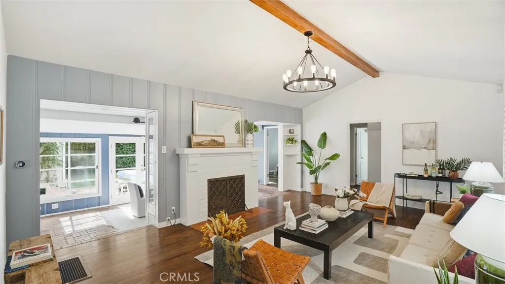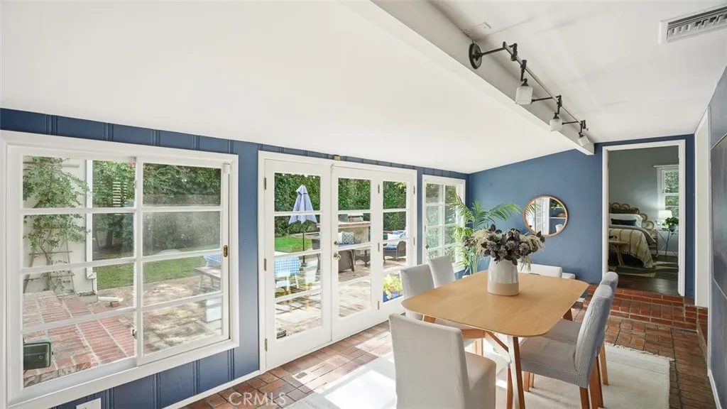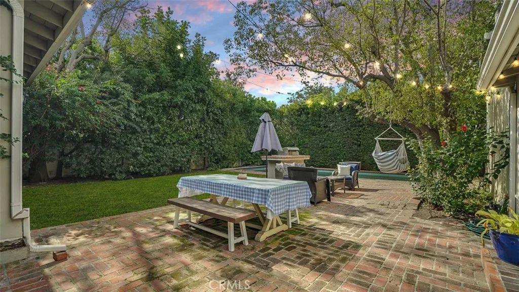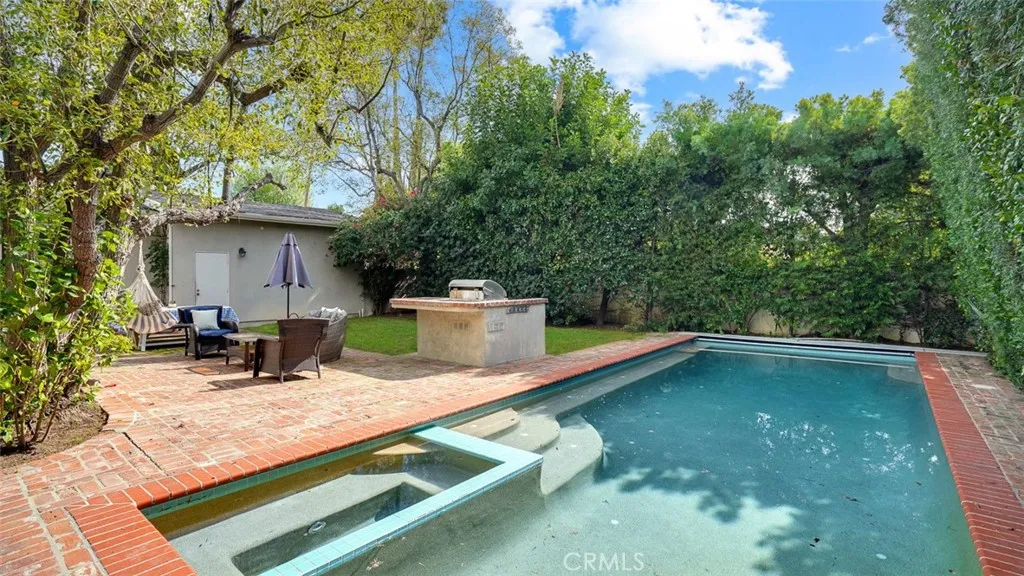 Tucked behind tall privacy hedges on a prime corner lot, this beautifully updated 3-bedroom + office, 3-bath ranch-style home offers effortless indoor-outdoor living in the heart of Sherman Oaks. Bathed in natural light, the thoughtfully designed floor plan blends classic charm with modern updates. A vaulted living room with beamed ceiling anchors the home, flowing seamlessly into a dining room that opens directly to the expansive backyard. The updated kitchen features Caesarstone countertops, stainless steel appliances, recessed lighting, and clean, timeless finishes. The spacious primary suite is a true retreat, complete with dual walk-in closets, French doors going out to the backyard, and a spa-inspired bath complete with soaking tub. Two generous secondary bedrooms and updated baths are thoughtfully positioned in a separate wing, while a detached office provides an ideal work-from-home setup or creative studio. Step outside to your own private oasis: a heated, covered saltwater pool and spa, built-in BBQ area, mature landscaping, and glowing bistro lights create the ultimate setting for entertaining or unwinding under the stars. Alley access to the two-car garage ensures both convenience and discretion. Recent upgrades include a new roof, Nest thermostat, Google Nest cameras, DoorBird video doorbell, and ADT security system. Refined, private, and move-in ready welcome home!
