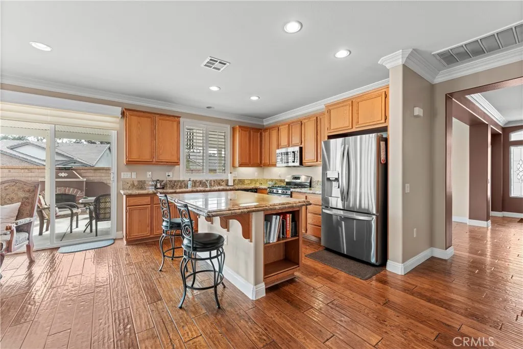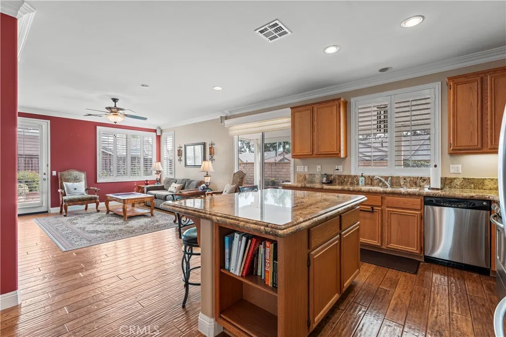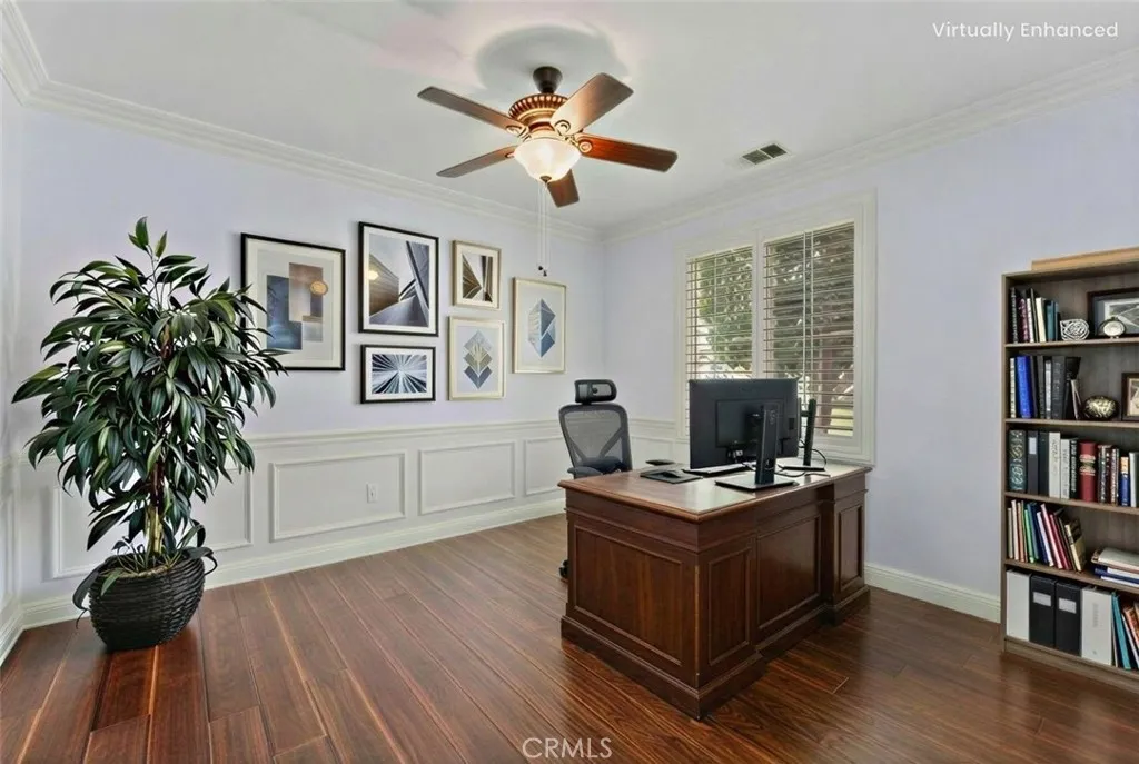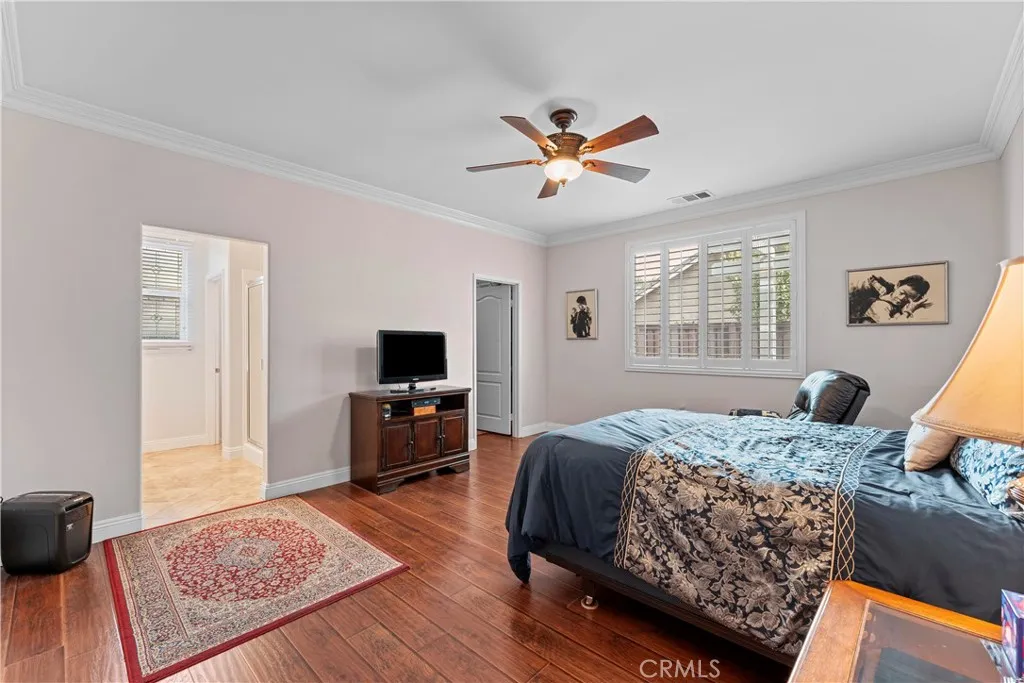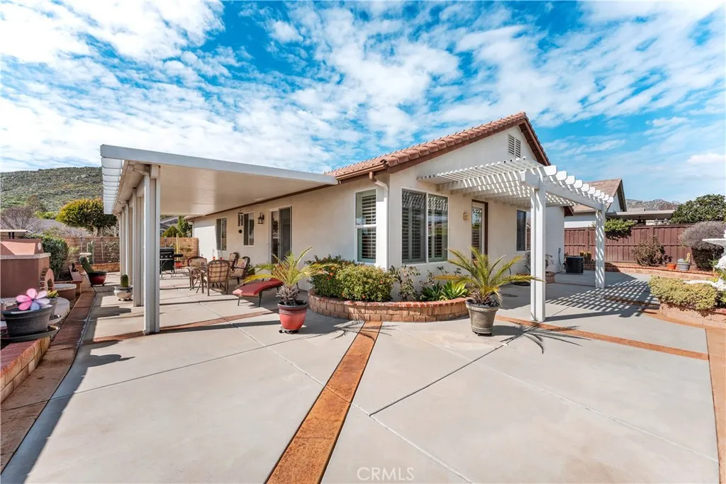 Discover a meticulously maintained home on a desirable corner lot in Hemets premier Four Seasons Over 55 community. This spacious, single-story residence offers comfort, low maintenance, and vibrant social opportunities all in one. With 2 bedrooms, 2 baths, a separate dining area, and a versatile office/den, its perfectly suited for effortless, lock-and-leave living. HIGHLIGHTS - Prime corner lot with great curb appeal and easy-access side yard - Open great room with built-in entertainment center, slider to the side yard, and direct door to the backyard - Elegant finishes throughout: wood floors, plantation shutters, crown molding, and ceiling fans in every room - Kitchen features wood cabinetry, granite countertops, pull-out drawers, and a pantry - Primary suite and guest bedroom/guest bath for comfort and privacy - Garage with epoxy flooring and abundant storage cabinets and shelves - Private outdoor retreat: low-maintenance yard, Alumawood patio cover, tranquil fountain, and a natural gas fireplace - Automated sprinkler/drip system keeps landscaping vibrant with minimal effort COMMUNITY AND LIFESTYLE - 24-hour security and a true resort-style atmosphere - Extensive amenities: Bistro, ballroom, theatre, game room, billiards, library, gym, salon, covered BBQ area, pool, spa, bocce, shuffleboard, tennis, and pickleball - Nearby attractions: casinos, Diamond Valley Lake, Temecula Wine Country - Convenient access to Palm Springs (40 miles), San Diego (65 miles), and Los Angeles (80 miles) This home is perfect for snowbirds, downsizers, or anyone seeking a vibrant, active 55+