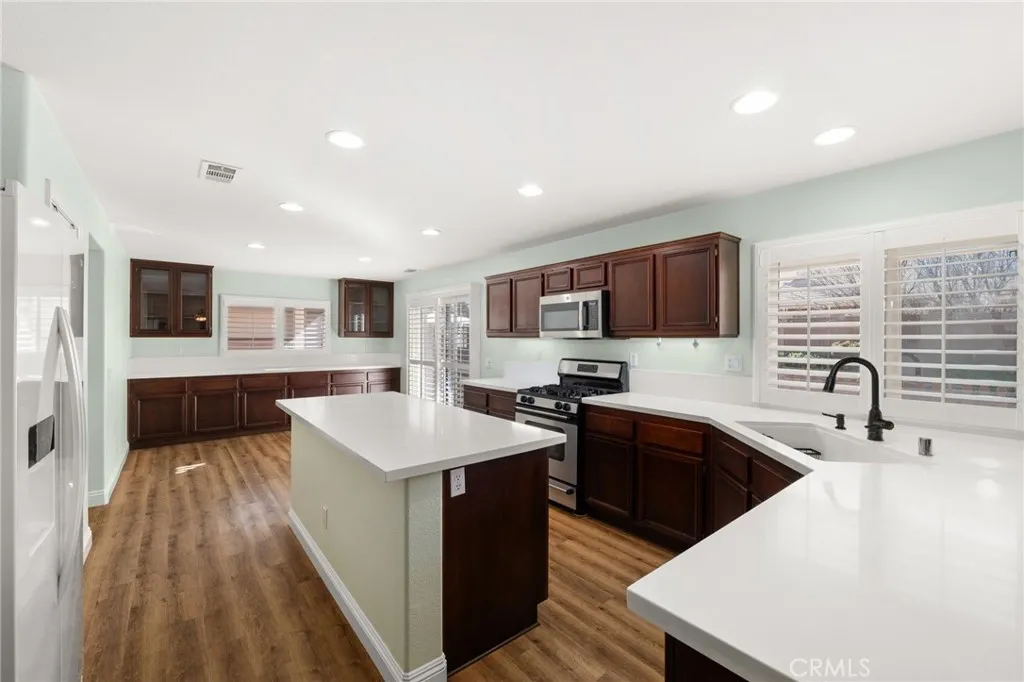 Turnkey six bedroom Sundance home with a three car garage and spacious private yard. This impeccably maintained home greets you with soaring two-story ceilings and a flood of natural light, highlighting the seamless transition between the open-concept living spaces and high-end finishes. From the designer plantation shutters and luxury vinyl plank flooring to the brand-new, plush carpeting, every inch of this home feels fresh and sophisticated. The three car garage features a number of built in shelves, and the Culligan Water Softening System in included. The laundry room, with additional storage, features an electric and gas dryer hook up. The culinary heart of the home is a true centerpiece, featuring a massive quartz island, professional-grade stainless appliances, and pantry with roll outs. Low power bills thanks to a leased solar system. The private backyard is pre-wired for a jacuzzi, and features a large covered patio. Perfectly positioned for both work and play, you are just minutes from the I-10 and Highway 60 corridors for an easy commute to Riverside or Palm Springs, and only 15 minutes from world-class shopping at the Desert Hills Premium Outlets.