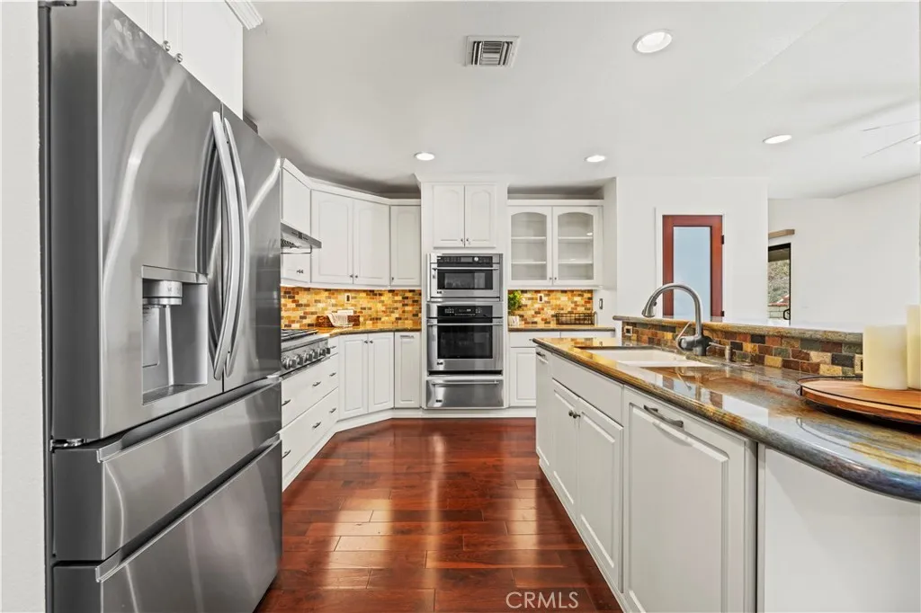 Located on desirable quaint street, this expanded two-story home offers just under 2,500 square feet with 5 bedrooms (4 upstairs plus a downstairs flex room) and 3 full bathrooms, with no HOA. Owned by the same family for nearly 37 years, the home was thoughtfully expanded to enlarge the kitchen and family room and add a versatile main-level bedroom or office. The remodeled gourmet kitchen features custom cabinetry, granite countertops, stone backsplash, 6-burner cooktop, separate oven, convection microwave, pantry, breakfast bar, and stainless appliances. Upstairs includes four spacious bedrooms and a primary suite with balcony, hillside views, dual sinks, soaking tub, and separate shower. Energy-efficient upgrades include owned solar, dual-zoned HVAC, and a mini-split system. Additional improvements include newer windows, recessed lighting, remodeled baths, hardwood flooring downstairs, new carpet upstairs, and fresh paint throughout. The professionally hardscaped backyard offers planters with drip irrigation, French drains, and gated access to more of the yard including a grassy hillside area. A true side-by-side 3-car garage and driveway space for a small boat or small RV add flexibility. Conveniently located near a neighborhood park and greenbelt, this well-maintained home offers space, functionality, and room!