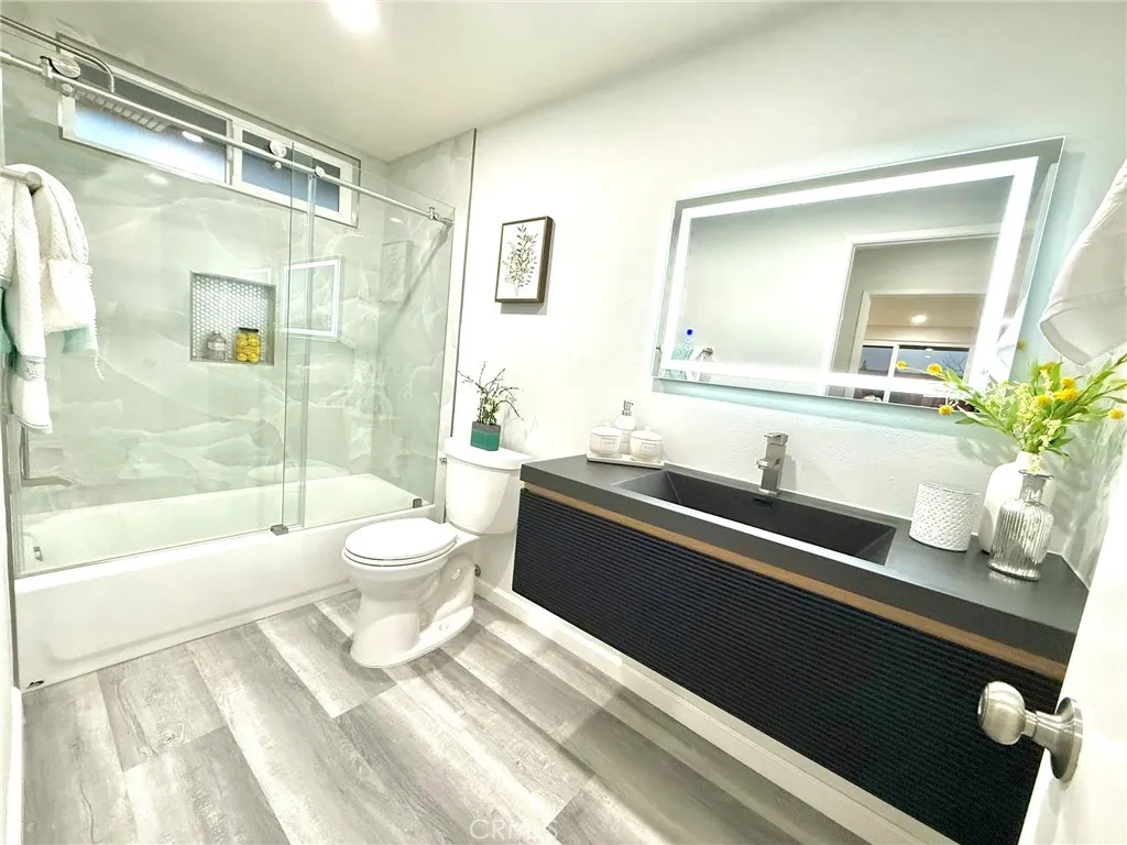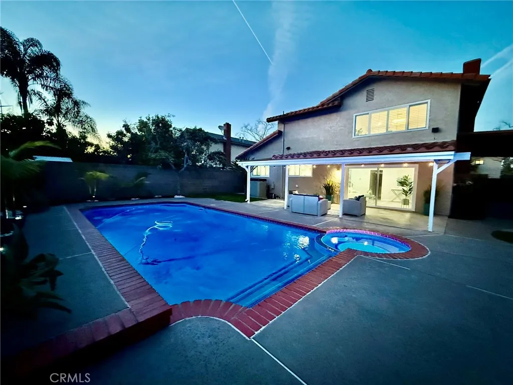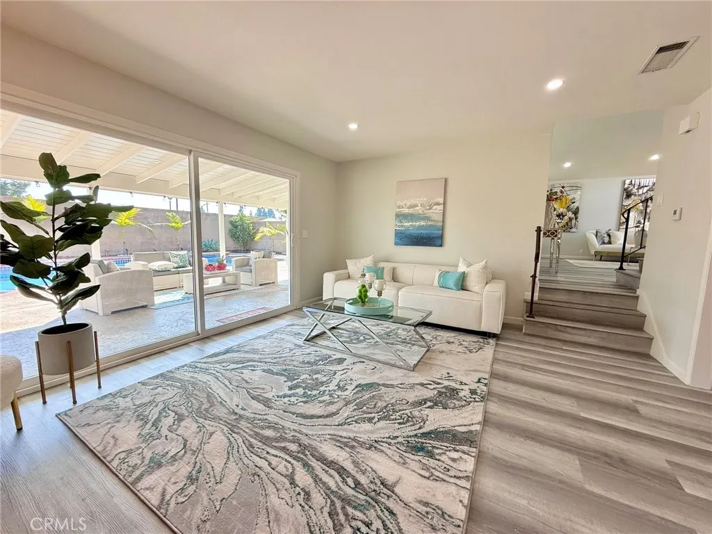 Welcome to this meticulously remodeled, two-level entertainers dream home, perfectly timed for summer enjoyment! Boasting over 2,000 square feet of elegant living space on a generous 6,849-square-foot lot, this 4-bedroom, 3-bathroom residence seamlessly blends modern sophistication with everyday convenience. A highly desirable main-floor bedroom and bath make it ideal for guests or multi-generational living. An impressive, oversized chocolate-cafe wood entry door with a decorative glass sidelight welcomes you into a sun-drenched interior, highlighted by a modern, geometric tiered crystal chandelier. The inviting living room features cathedral ceilings and recessed lighting, flowing naturally into a formal dining area. Neutral waterproof vinyl flooring runs throughout the entire home. The upgraded chefs kitchen showcases quartz countertops and comes fully equipped with a five-burner cooktop, range hood, dishwasher, and a premium 3-door Samsung Bespoke refrigerator with a beverage center. The cozy family room is anchored by a romantic fireplace, tastefully modernized with acoustic slat wall panels and integrated LED lighting. Sliding glass doors create an effortless indoor-outdoor flow to your private backyard oasis, featuring a sparkling lighted pool with fountain and heated spa. Upstairs, the spacious primary suite includes a walk-in closet and a double-sink vanity with a frameless LED mirror. Two additional bedrooms are well-appointed, sharing a modern hallway bath. Additional features include a durable tile roof, covered RV parking, a two-car garage with direct interior a