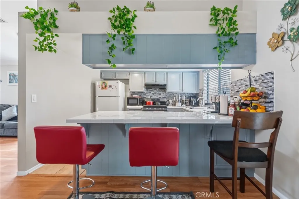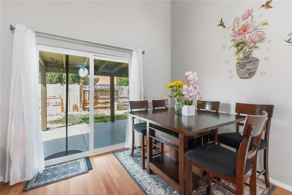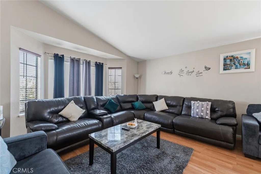 Vaulted ceilings and a floor-to-ceiling brick fireplace set the tone the moment you step through the front door of this 3-bedroom, 2-bath single-family home on Dawson Drive. The living room is generous in scale, filled with natural light, and anchored by that statement fireplace, the kind of architectural detail that gives a home real character. Hardwood-style flooring runs through the main living areas and all three bedrooms, creating a cohesive, warm feel throughout. The kitchen features updated slate-blue cabinetry, a decorative tile mosaic backsplash, a gas range, and tile flooring functional and thoughtfully finished. A dedicated indoor laundry room with built-in shelving keeps daily living organized and efficient. Each bedroom is well-proportioned with good natural light and comfortable space for everyday living. The 2-car garage and wide concrete driveway provide ample off-street parking. Out back, the yard is set up for real outdoor living. A covered pergola patio with pavers creates a defined space for dining or relaxing, while the wood-fenced yard offers privacy and room to spread out. A concrete side yard runs the full length of the property, adding additional usable space. Located within walking distance of Golden Poppy K-8, Joshua Hills Elementary, and Mesa Intermediate, with Palmdale High School just under 2 miles away. Central heat and air conditioning. 1,564 sq ft of living space on a 6,791 sq ft lot. Schedule your tour Today!