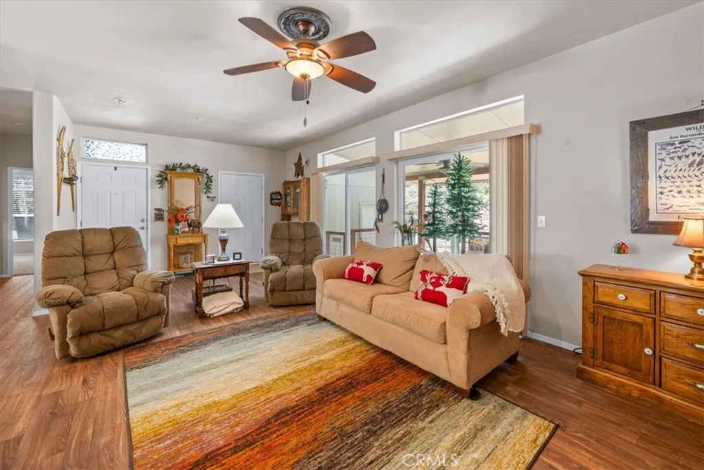 Manufactured home on a permanent foundation not located in a trailer park! You own the building and the land. Real title conveyed. Enjoy modern mountain living on a quiet street in Sugarloaf. Built in 2014 with a custom floor plan, this well-maintained modified manufactured home offers 3 bedrooms, 2 bathrooms, and approximately 1,350 sq ft of comfortable living space on a spacious 7,000 sq ft lot. Located on a pet-friendly street with minimal traffic and mostly full-time residents, the neighborhood offers a peaceful setting with very few short-term rentals. Inside, youll find an open floor plan with high ceilings, recessed lighting, and a bright great room layout where the gorgeous kitchen flows seamlessly into the dining and living areasperfect for entertaining or relaxing after a day in the mountains. The large breakfast bar is ideal for casual meals or morning coffee. The home comes fully furnished and includes appliances, making it truly move-in ready. The property is also equipped with a compliant fire suppression system. Additional features include extended eaves, a covered front entry to help keep snow off during winter months, and an attached garage. The home has never been used as a rental and has been lovingly maintained in excellent condition. Step out to the backyard patio with easy yard access and enjoy the convenience of National Forest access just at the end of the streetperfect for hiking, biking, and outdoor adventures. Located just about 5 miles from Big Bear Lake, youre a short drive from the Village, two ski resorts, the golf course, Alpine Pedal Path,