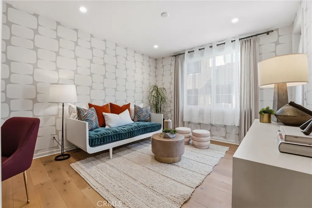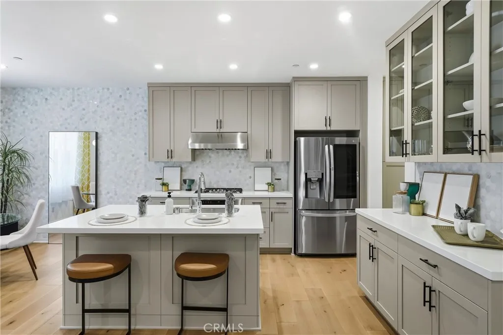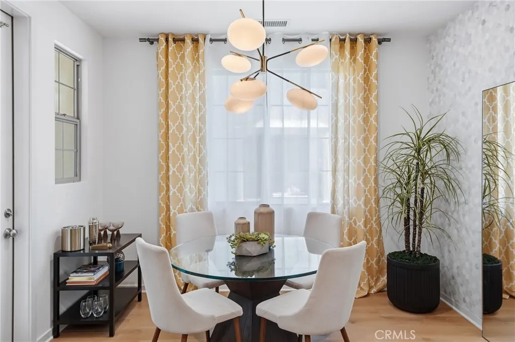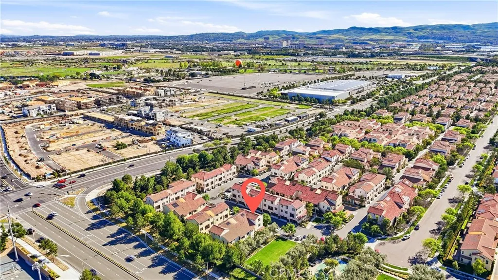 Originally designed as the builders model and positioned across from a rare greenbelt that brings added openness and natural light, this three-level Great Park residence offers upgraded finishes and a layout that stands apart from the standard plan. The main living level unfolds with an open kitchen featuring quartz countertops, glass-front cabinetry, modern lighting, and a distinctive honeycomb backsplash that extends into the dining wall. A generous island anchors the space and flows naturally into the living room, creating a comfortable setting for everyday living or hosting. The adjacent balcony provides an easy outdoor extension, while a bedroom, full bath, and built-in workspace add flexibility on this level. Upstairs, two spacious bedrooms each feature their own en-suite bath with laundry conveniently located nearby. Energy-conscious features include an owned solar system, energy-efficient construction, heat pump heating and cooling system, tankless water heater, smart home controls (Nest/Ring), and Cat-6 wiring for enhanced connectivity making it a modern infrastructure designed for todays connected lifestyle. Additional highlights include epoxy flooring in the garage and thoughtful upgrades throughout. Located within Irvines Great Park neighborhoods, where parks, trails, pools, and gathering spaces are woven throughout the community.