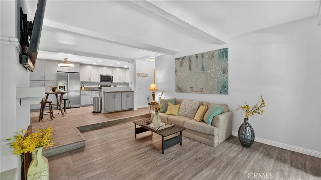 Located minutes to the beach in desirable gated community of Sea Spray! This beautiful home is located on the 2nd floor and features a spacious living area with fireplace and wood beamed ceilings that opens to a private balcony, a beautifully remodeled and expanded kitchen with stainless steel appliances including a double oven and quartzite counter tops. Beautiful laminate wood floors throughout all areas, two remodeled bathrooms with quartzite countertops, a spacious primary bedroom complete with a walk in closet and another private balcony. Additional highlights include interior laundry area with washer, dryer and shelving. This home comes with a detached garage and one assigned parking place, plus community EV charging and additional guest parking. Community amenities include a recently upgraded pool and spa, lighted tennis courts, a clubhouse, greenbelts and beautifully landscaped grounds. HOA includes water, gas and trash as well as a electric gate for homeowners. Prime location just 1.25 miles to the Huntington Beach, the pier, Main Street. Close to dining, shopping, nearby access to bike or jog the river trail. Also conveniently located near Edison High School, Golden West College and quick access to 405 and 22 freeways.