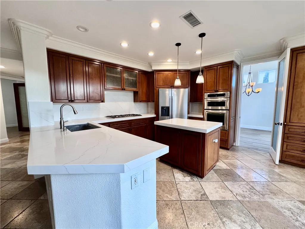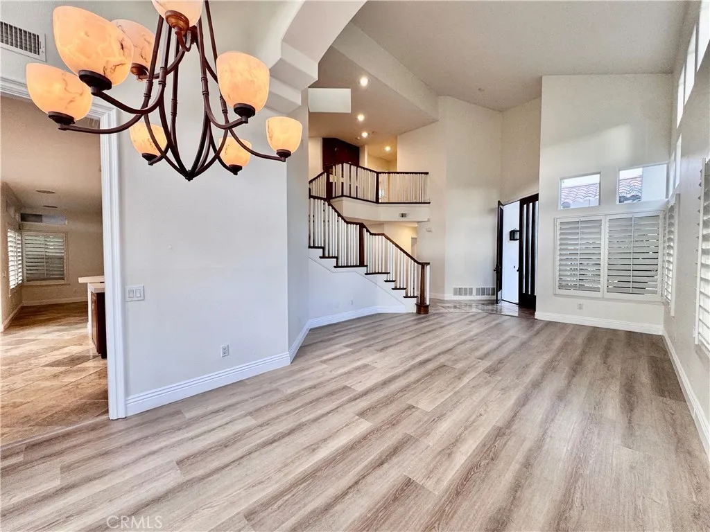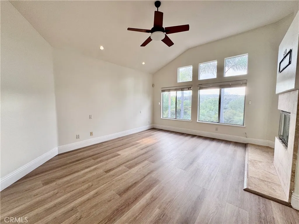 Approximately 2,751 square feet of living space with four bedrooms and four bathrooms awaits you! The home is situated on a lot of approximately 0.1647 acres within the Amarante at Marina Hills community. The open floor plan features cathedral ceilings and an awesome formal entry. The living room includes a private fireplace, and the formal living room and dining area are conveniently located an covered in new luxury flooring. The upgraded kitchen is equipped with stainless steel appliances, custom cabinets, quartz counters and island that is draped with an appealing sconce lighting fixture. New flooring leads you to the primary bedroom that includes new luxury flooring and a private fireplace plus a private deck view deck, as well as a spacious master bathroom with a large closet that could potentially be converted into a fifth bedroom. Upstairs, there are two additional secondary bedrooms and a full bathroom. The home also has a walk-in laundry room with cabinets and folding area on the lower level plus a three-car garage. The backyard provides an entertaining space with a pool-sized lot, a custom barbecue area, and the opportunity to enjoy sunset views. Residents of the Amarante at Marina Hills community have access to a variety of amenities, including a junior Olympic pool, banquet facilities, a spa, sports courts, tennis courts, a bocce ball court, hiking trails, and a barbecue area. The community is conveniently located near shopping, dining, and world-class beaches and golf courses, in an award-winning school district.
