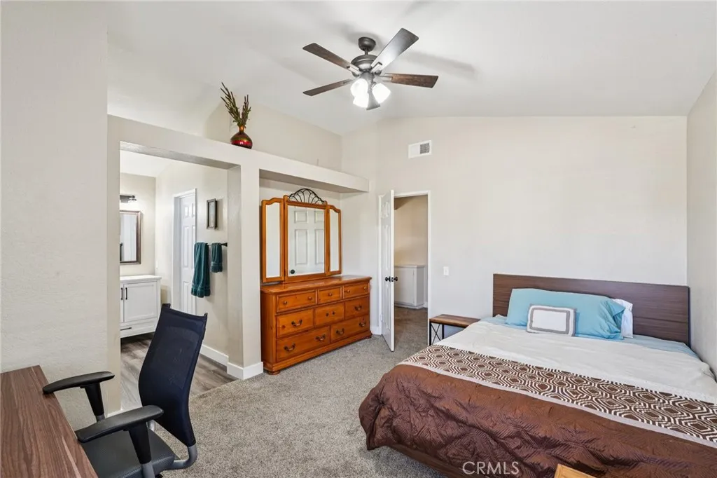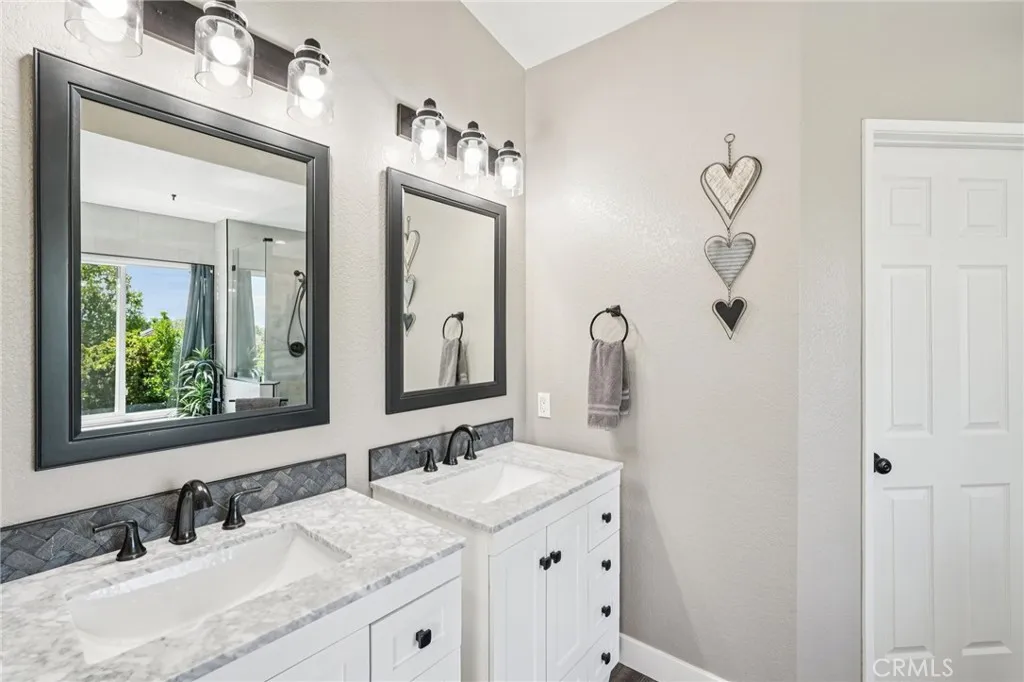 This stunning two-story home in Central Murrieta combines modern upgrades with a functional layout perfect for dual-living arrangements. Boasting exceptional curb appeal with an inviting front porch, the entry opens into a formal living and dining area featuring soaring cathedral ceilings, updated lighting, and contemporary vinyl plank flooring throughout the main level. The heart of the home is a remodeled cooks kitchen, complete with quartz countertops, an eat-in island peninsula, and updated white cabinetry. It features a large single-basin sink, black stainless steel appliances, a tile backsplash, and recessed lighting. The kitchen flows seamlessly into the family room, which is anchored by a cozy fireplace and ceiling fan, with French doors leading to the backyard. Convenience is key with a downstairs bedroom featuring double-door entry and an adjacent fully updated bathroom boasting a new vanity, quartz counters, and a modern tile walk-in shower. Upstairs, you will find dual primary suites: Suite #1 Offers a walk-in closet and a beautifully remodeled bathroom with a custom tile shower, white vanity, and updated fixtures. Suite #2 (the true primary): An expansive retreat with an extra-large bedroom and walk-in closet. The spa-like ensuite features two new white vanities, framed mirrors, a huge walk-in glass shower, and a separate soaking tub. The exterior is designed for easy living with a covered patio, low-maintenance astro-turf, like new vinyl fencing, and a large storage shed. Located near top-rated Murrieta schools, shopping, and freeway access, No HOA and LOW TAX