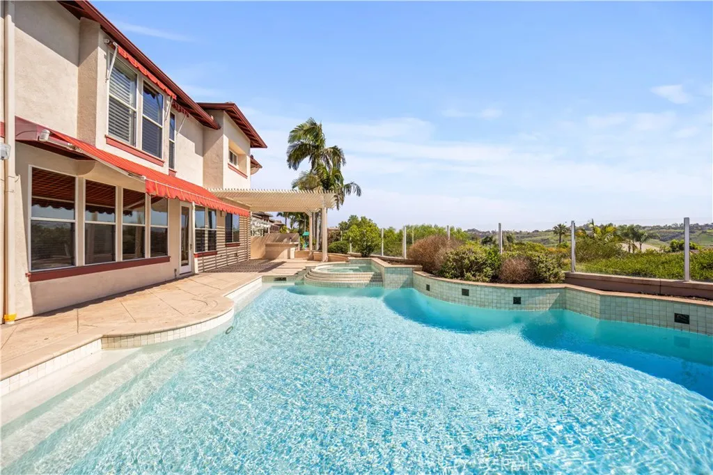 Situated on a quiet cul-de-sac within a well-established Laguna Niguel community. Offers a refined combination of expansive views, natural light, &open-concept living. Multiple vantage points from the main living areas, primary suite, & outdoor spacescapture layered ocean, hillside, & city light views, creating a dynamic visual backdrop throughout the day. 5 bedrooms, 3 bathrooms, & a 3-car garage, with about 3,247 sqft living space, approximately 6,300 sqft lot. Seamless open layout, the living, dining, & kitchen areas flow naturally, enhanced by select double-height ceilings that add volume and architectural presence. Large windows and multi-directional exposure bring in abundant natural light while reinforcing a strong indooroutdoor connection. A flexible office with custom built-in cabinetry offers the potential to function as a 5th bedroom, conveniently located adjacent to a full bathroom and a separate single-car garage with window access. The kitchen equipped with a central island, double ovens, & generous cabinetry, offering both functionality and everyday usability. A formal dining room with chandelier provides a defined setting, while the family room features built-in cabinetry and a fireplace, creating a comfortable and inviting living space. The primary suite includes dual walk-in closets and a spacious bathroom with a soaking tub and separate shower. Outdoor living is thoughtfully designed, featuring a private backyard with a pool, spa, patio, & BBQ areabalancing comfort, privacy, & view enjoyment. A distinctive feature of the property is its split garage confi